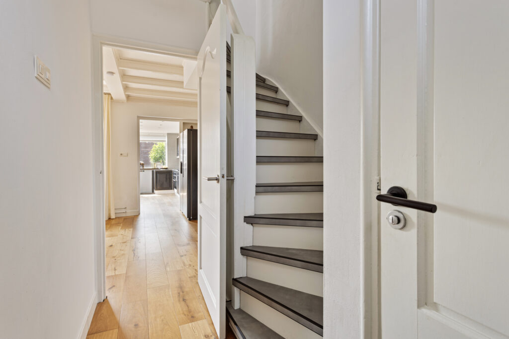 – Toegang tot lichte living voorzien van eikenhouten vloer met vloerverwarming, kunststof schuifpui naar tuin/terras, strak gestuukte wanden en een trapkast waarin zich tevens de vernieuwde groepenkast, watermeter en gasmeter bevindt.
