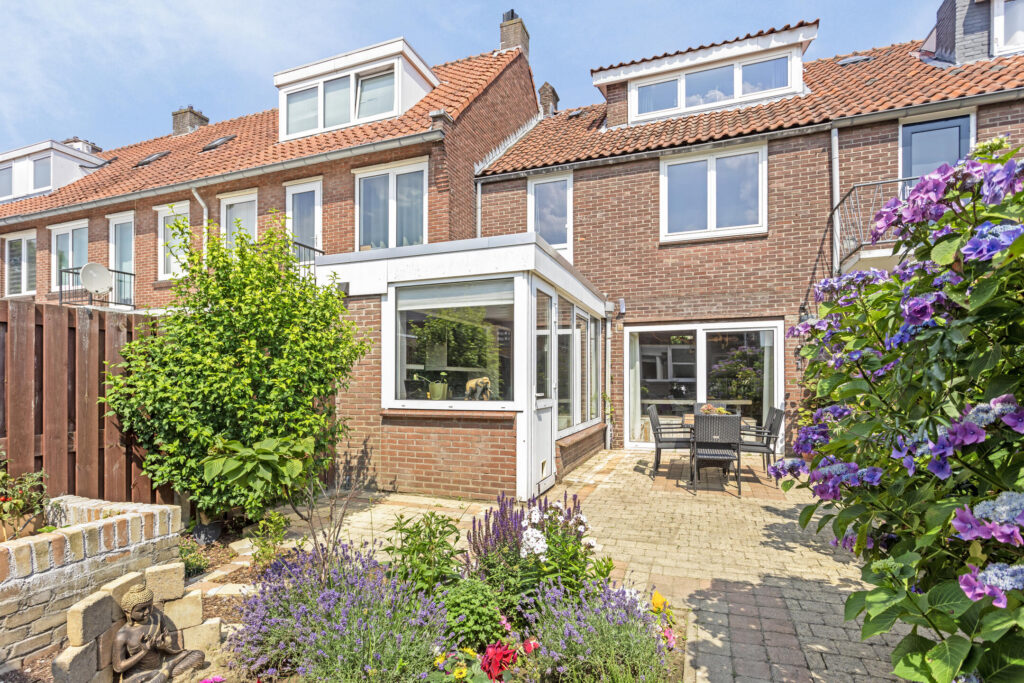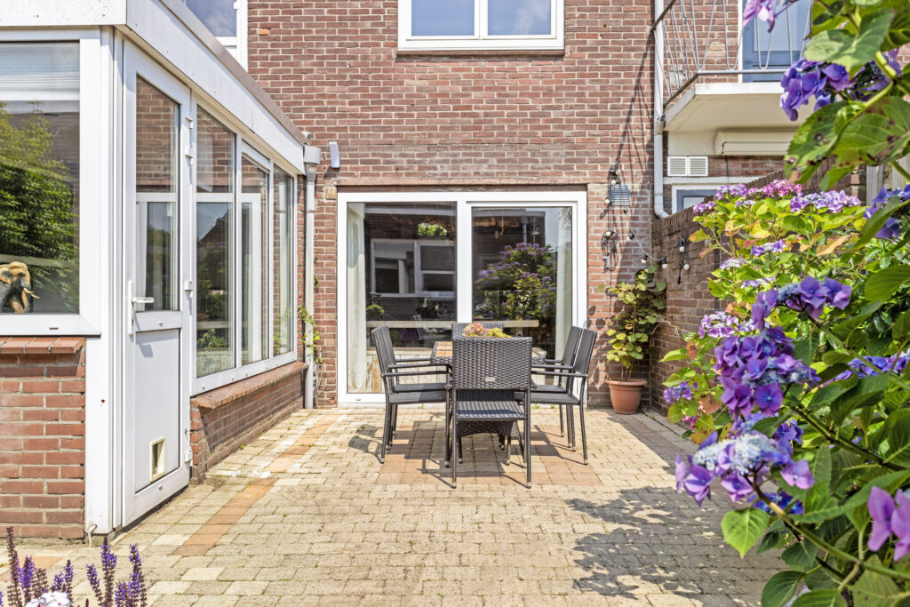 – Achtertuin voorzien van sierbestrating en beplanting en moestuin gelegen op het zonnige zuidwesten.