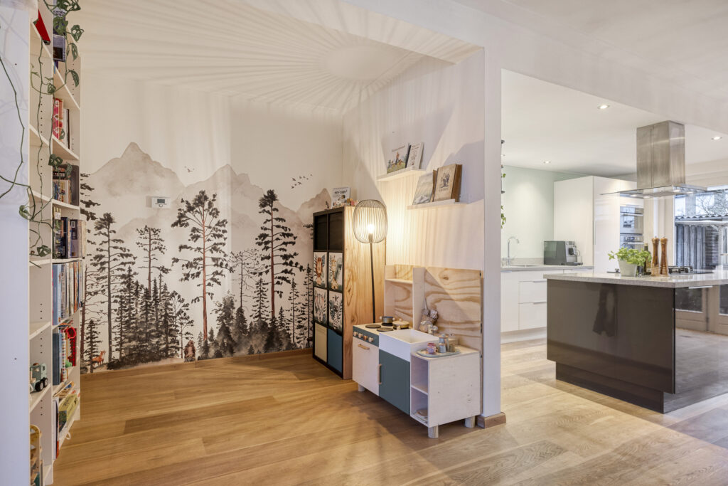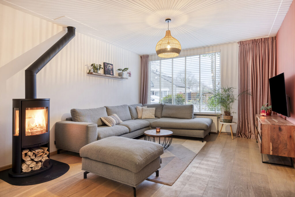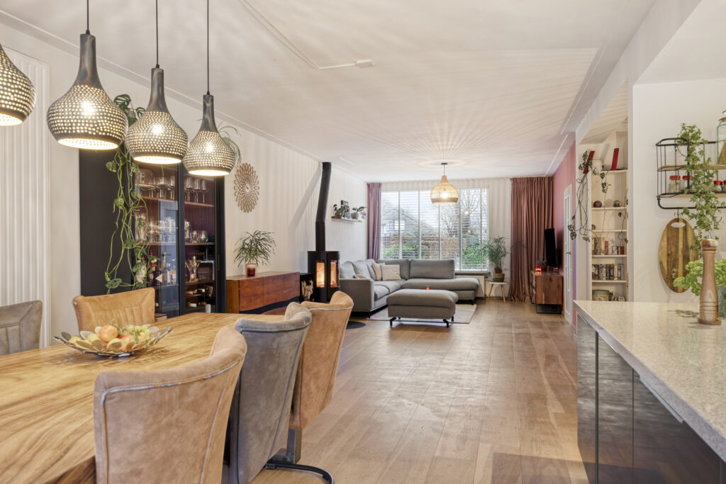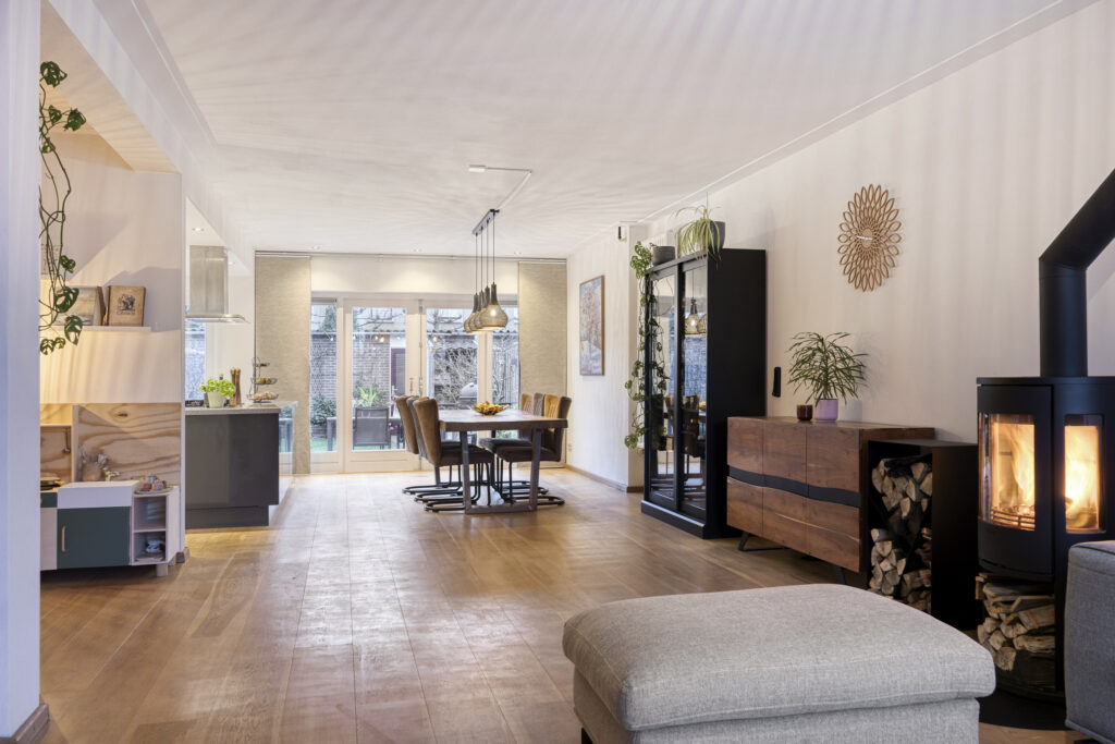 De woonkamer is royaal en voelt direct indrukwekkend aan. Dankzij de uitbouw over de volledige breedte is er een heerlijke leefruimte ontstaan met veel lichtinval. De sfeervolle open haard vormt het warme middelpunt van de kamer. In combinatie met de prachtige houten vloer, het strakke stucwerk en de sierlijsten ontstaat een uitnodigende plek om samen te komen, te ontspannen of te genieten van lange avonden. Ook heeft de woonkamer een extra hoek die zich perfect leent als speelhoek, kantoorplek of gezellige leesruimte. Onder de trap is een praktische trapkast te vinden voor extra opbergruimte.