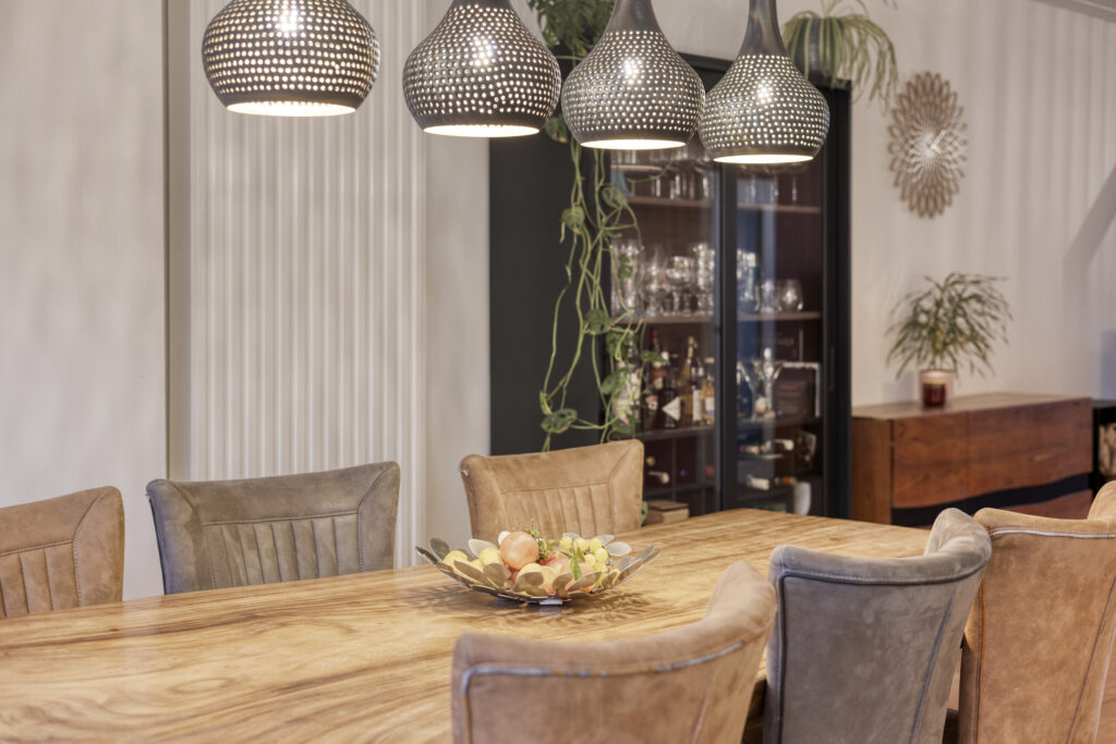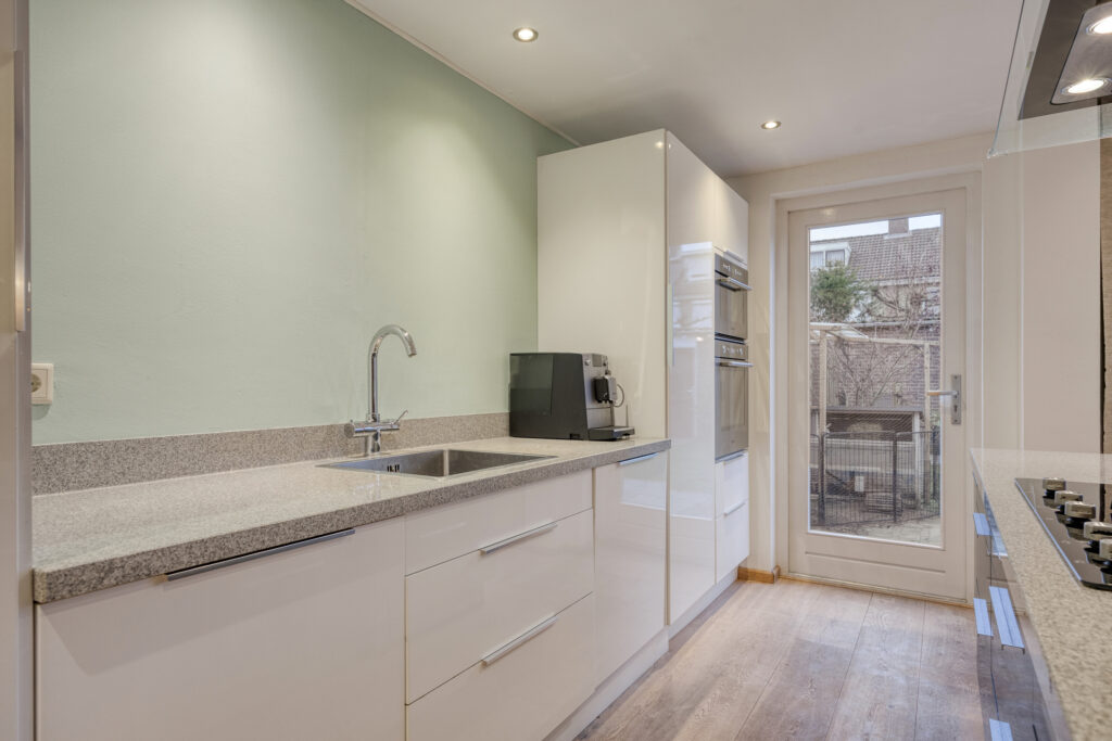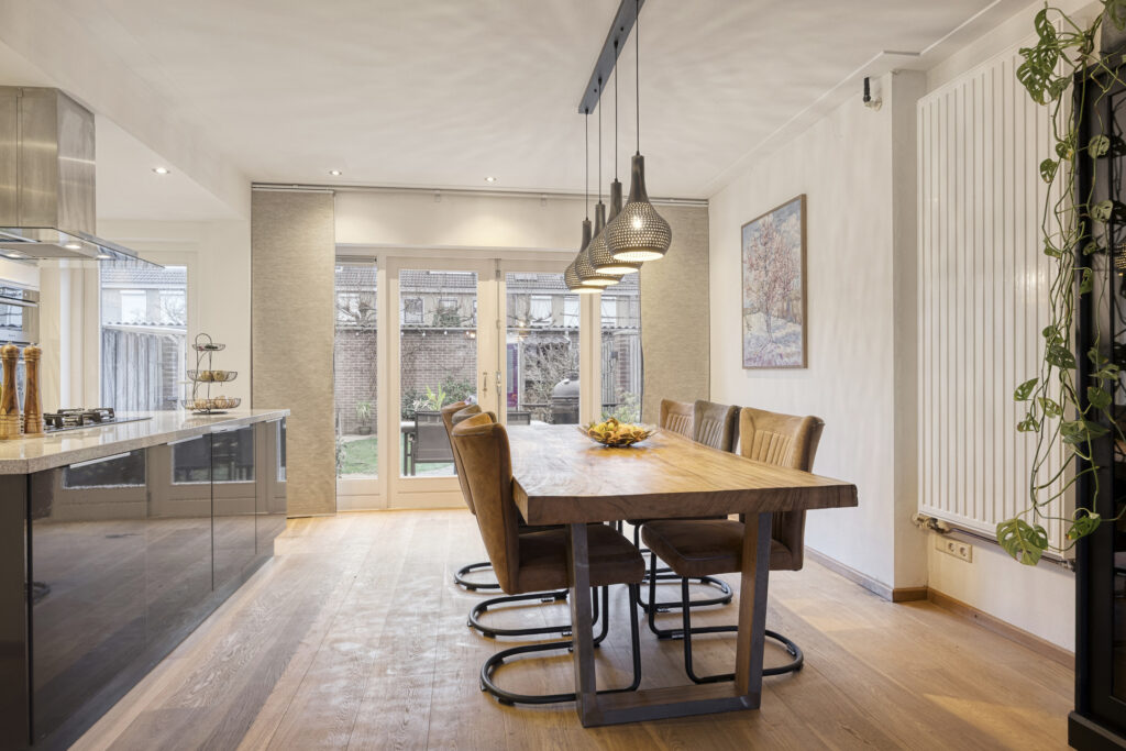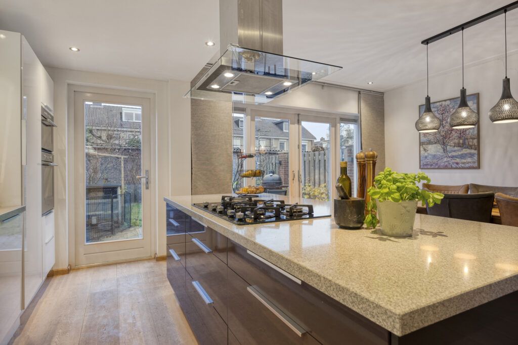 De moderne open keuken bevindt zich in de uitbouw en is een echte eyecatcher. Het royale kookeiland vormt het hart van deze ruimte en is uitgerust met een 4-pits gasfornuis met wokbrander, afzuigkap, vaatwasser, oven, combi-oven magnetron en een ruime koelkast. Aan werk- en bergruimte is geen gebrek. Via zowel de keuken als de openslaande deuren in de eetkamer bereikt u de zonnige achtertuin. Hier geniet u op mooie dagen optimaal van het buitenleven.