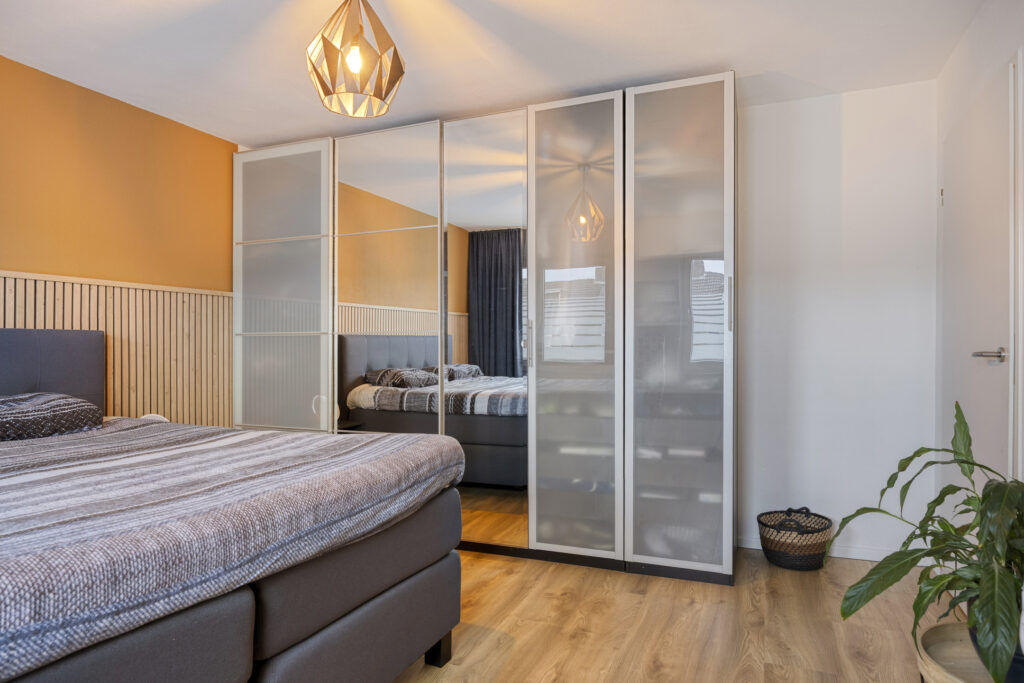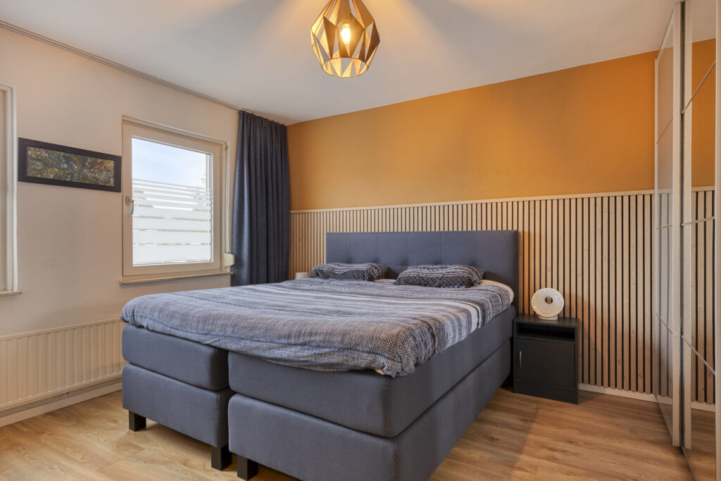 De eerste slaapkamer, tevens de masterbedroom van deze woning, is een royale kamer met een houten paneelwand. Er is volop ruimte voor een groot bed en een kledingkast. De kamer is voorzien van rolluiken en geniet van veel lichtinval.