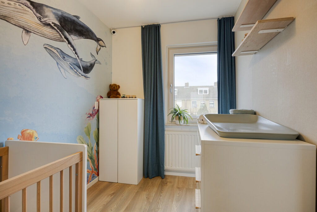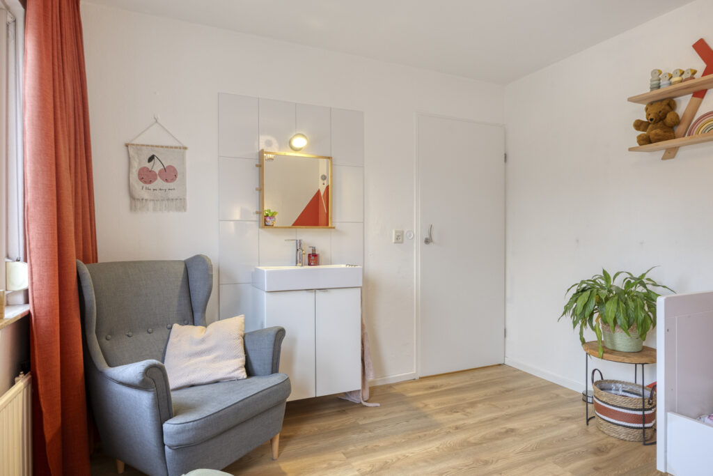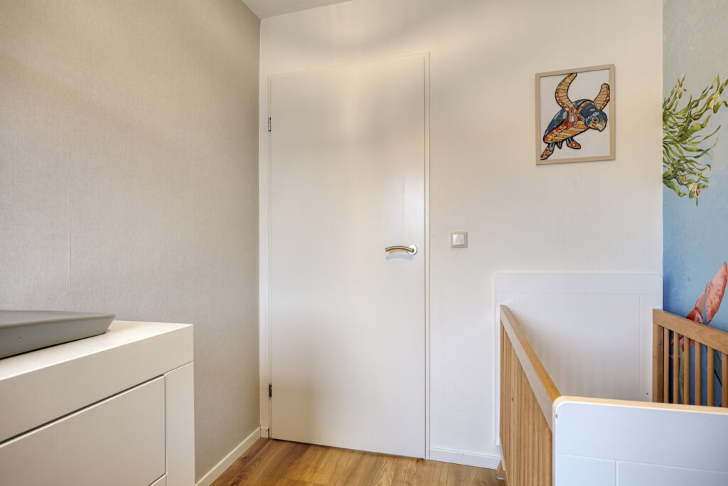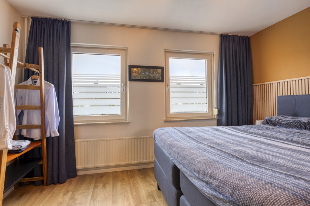 De derde slaapkamer bevindt zich aan de voorzijde van de woning. Deze ruime kamer beschikt over een eigen wastafel en is eveneens keurig afgewerkt met rolluiken. Door de grootte en indeling is deze kamer veelzijdig te gebruiken, bijvoorbeeld als extra slaapkamer of werkkamer.