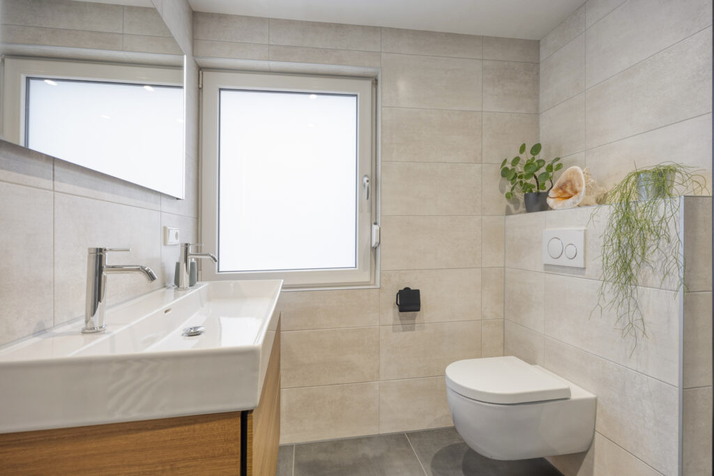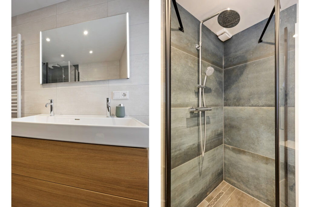 De badkamer is volledig vernieuwd en uitgevoerd met een dubbele wastafel in meubel, grote spiegel met verlichting, ruime douche, toilet, designradiator, inbouwspots en mechanische ventilatie.