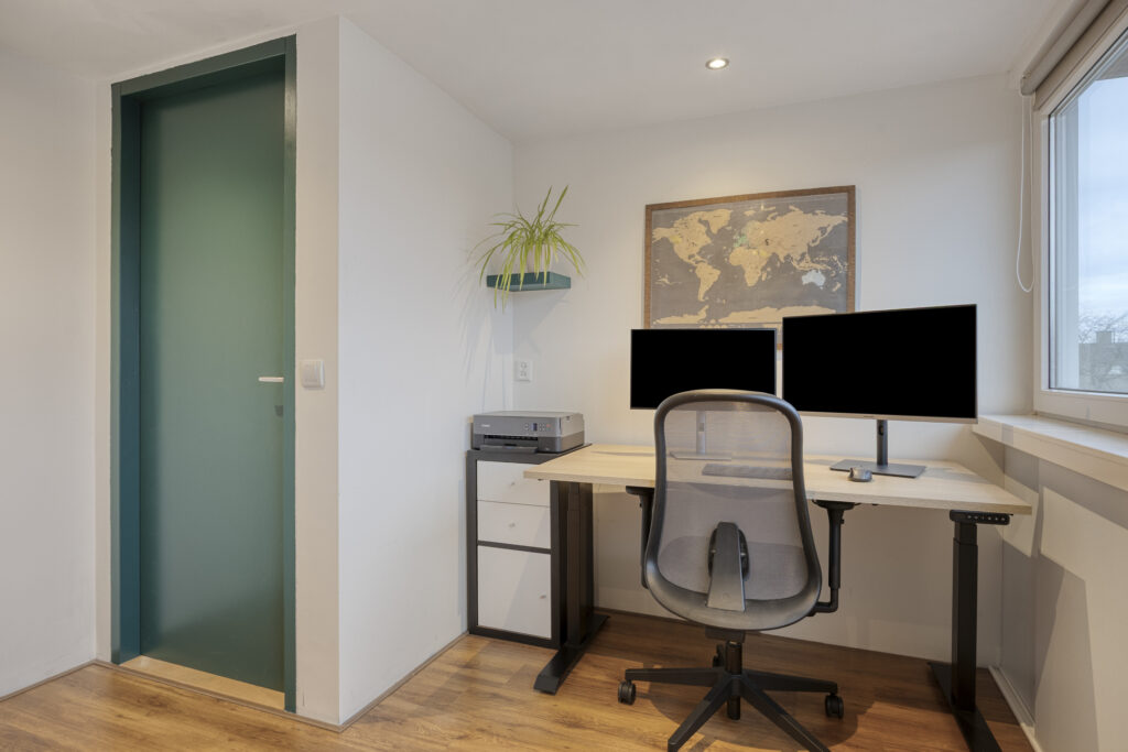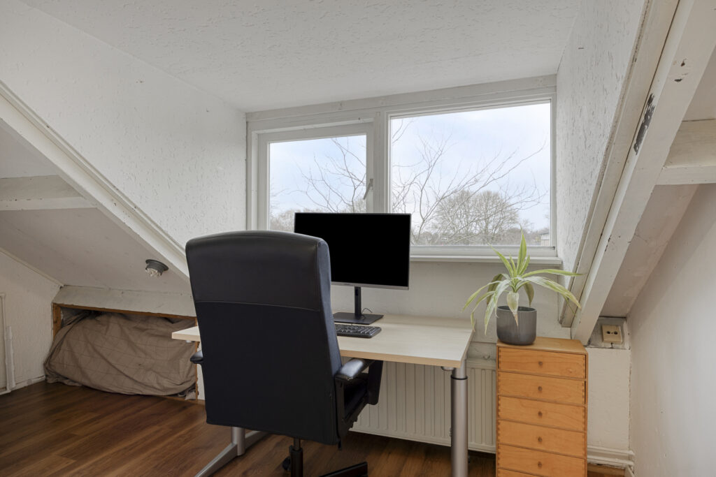 Aan de voorzijde ligt de vijfde slaapkamer. Deze kamer is iets kleiner, waardoor het een ideale ruimte is als kantoor of extra slaapkamer. Ook deze kamer is voorzien van een dakkapel, wat zorgt voor extra lichtinval.