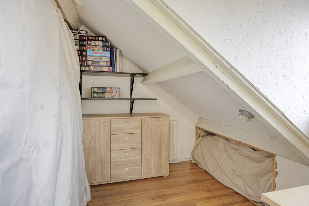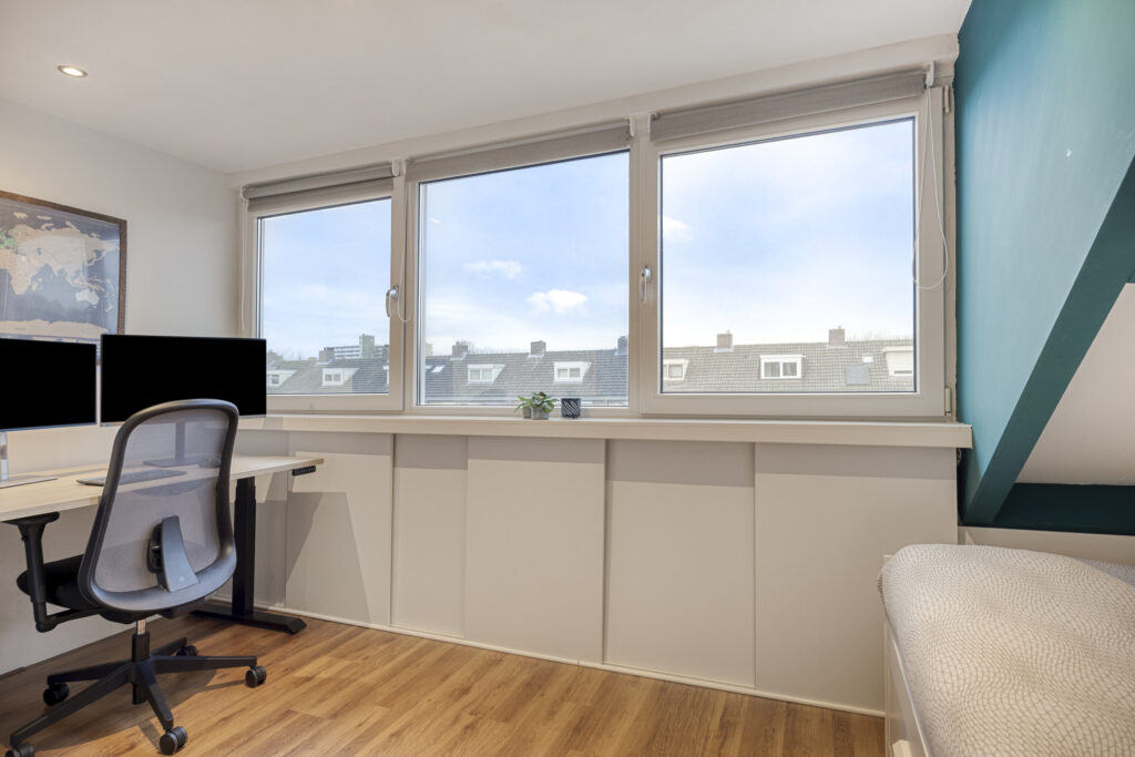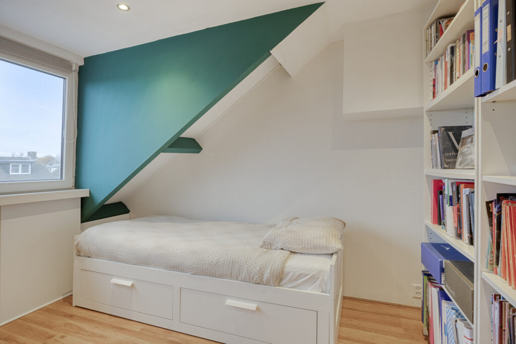 Op deze verdieping vindt u de vierde slaapkamer, een royale kamer voorzien van een dakkapel. Achter de knieschotten is bergruimte gecreëerd, waardoor de kamer functioneel en praktisch is.