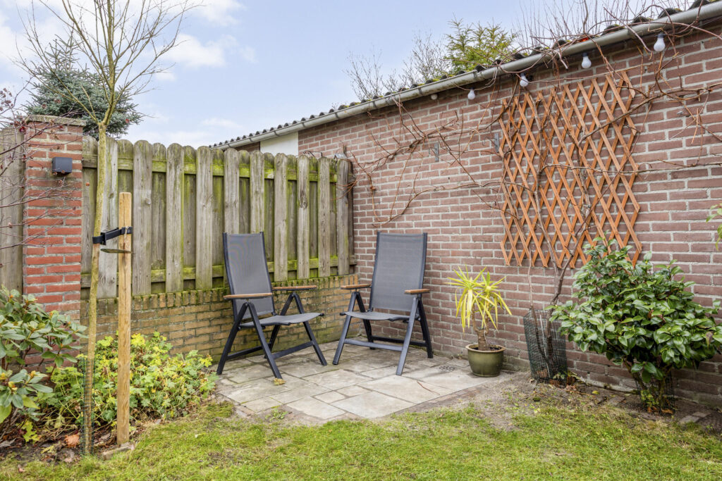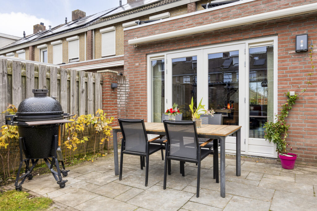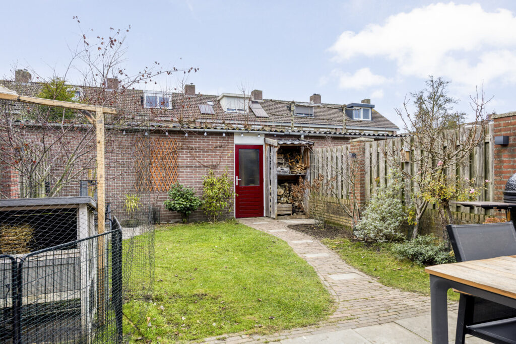 De achtertuin is fraai aangelegd met antracietkleurige tegels, groenborders en een ruim terras. Achterin staat een stenen berging met achterom, ideaal voor het stallen van fietsen, het opbergen van hobbyspullen of tuinmaterialen. De tuin biedt een rustige en zonnige plek om te ontspannen of buiten te genieten.