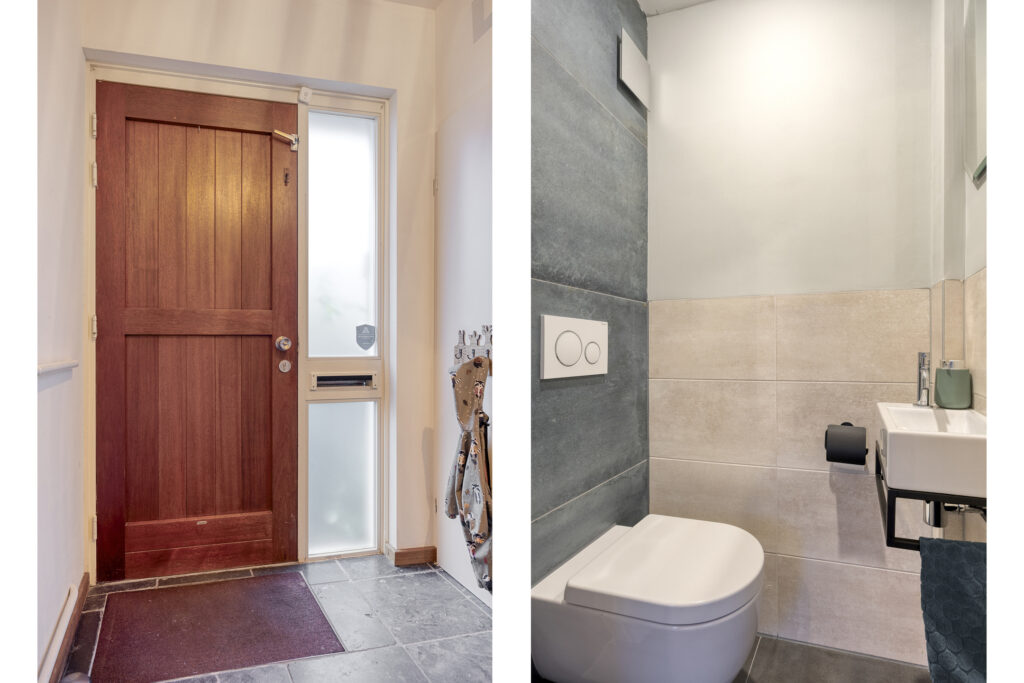 U komt binnen in de ruime hal waar zich de garderobe, meterkast en de toiletruimte bevinden. Het toilet is recent vernieuwd en uitgerust met een zwevend closet, wastafel en mechanische ventilatie. Vanuit de hal loopt u door naar de woonkamer.