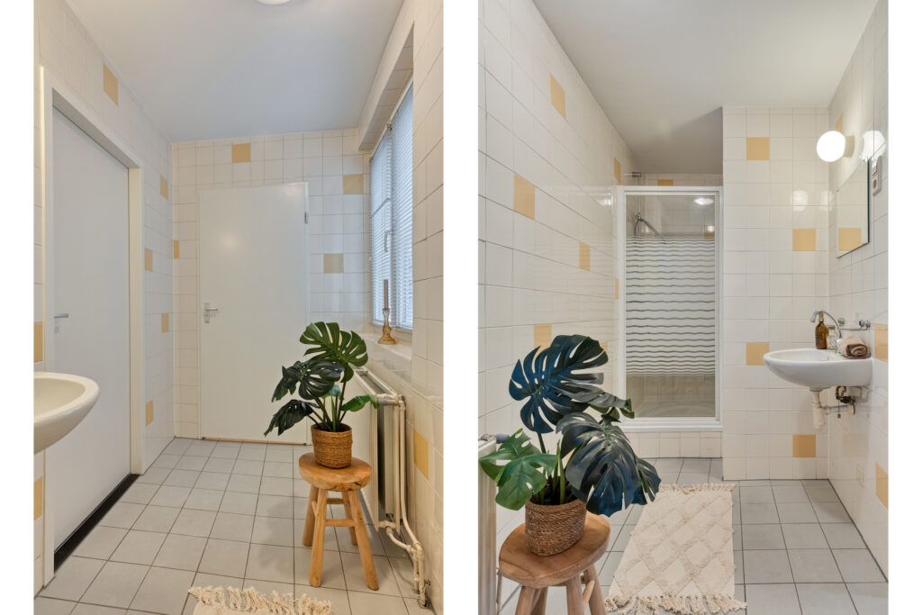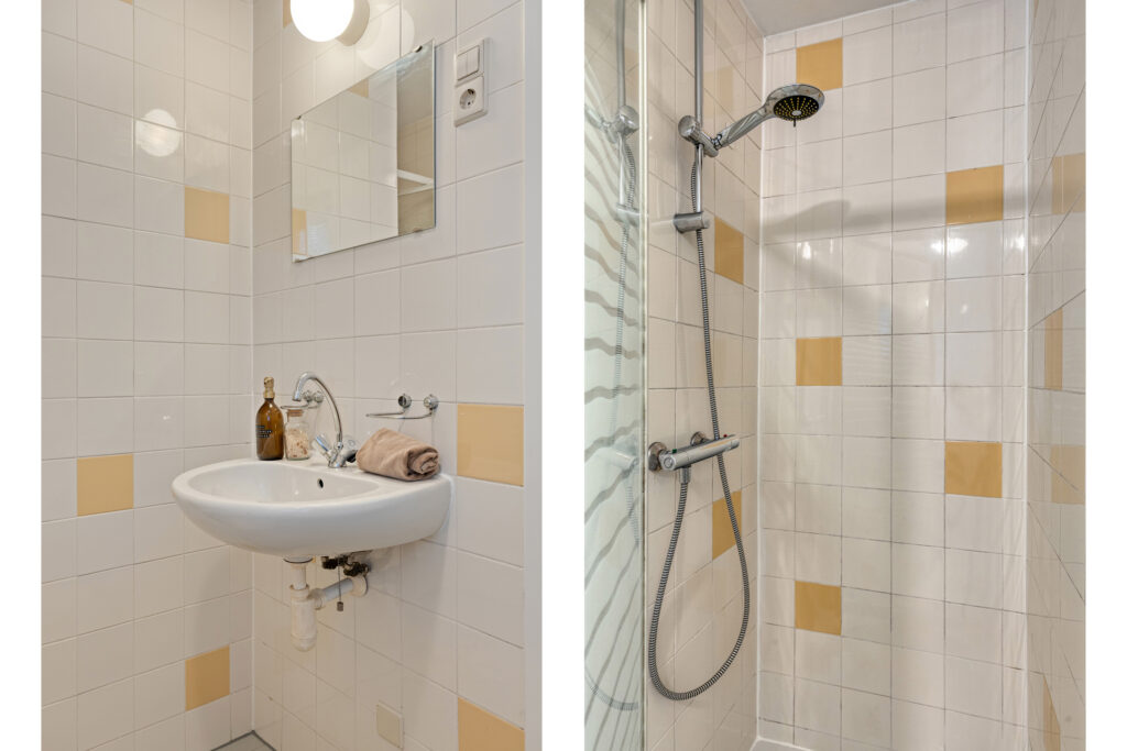 De badkamer is volledig betegeld, heeft prettig daglicht door het raam met dubbel glas en is ingericht met een ruime douchecabine en wastafel. Naastgelegen vind je de aparte toiletruimte die eveneens volledig betegeld is en voorzien van een modern toilet.
