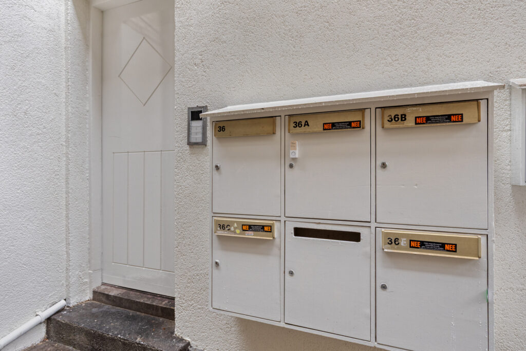 Gezamenlijke entree met brievenbussen en trapopgang naar de eerste verdieping. De algemene ruimtes zijn recent aangepakt en onder meer voorzien van nieuwe trapbekleding.
