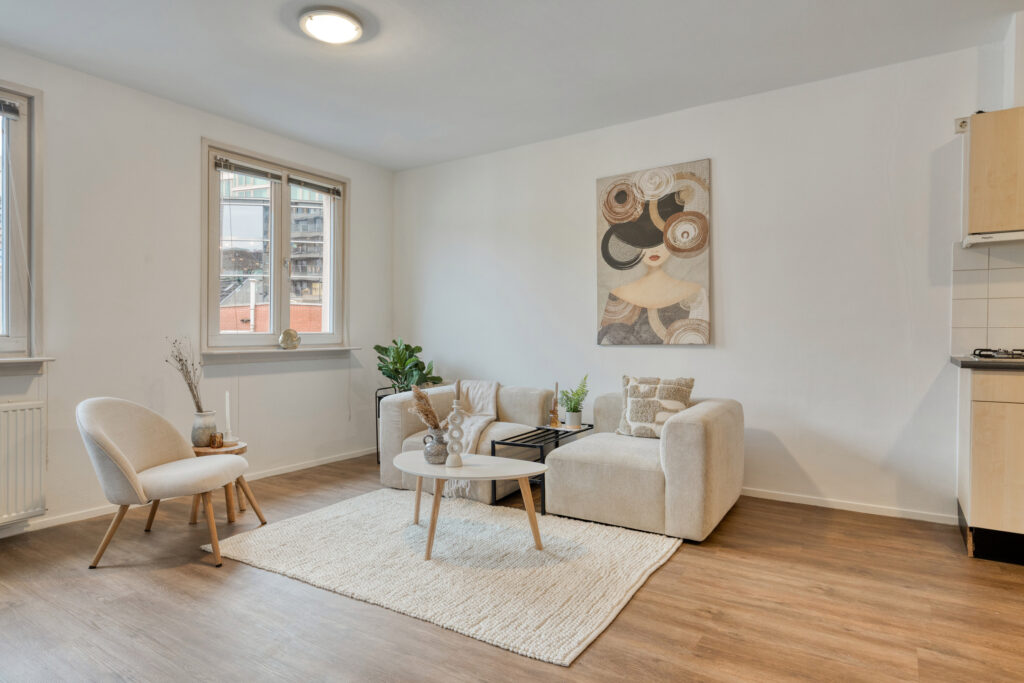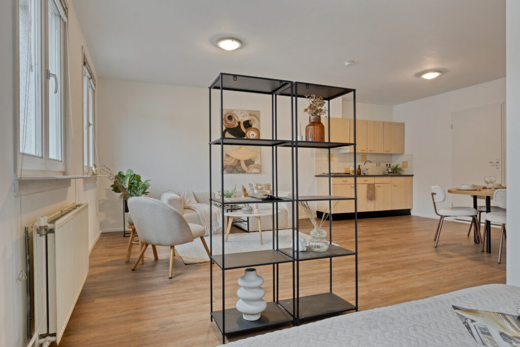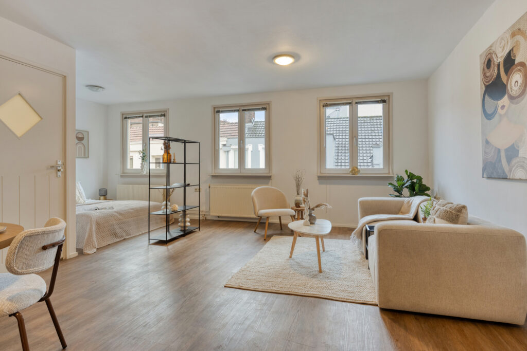 Binnenkomend valt meteen de frisse afwerking op. De studio is volledig voorzien van een mooie PVC houtlook vloer en recent geschilderde wanden en plafonds. De ruimte is open en flexibel in te delen, waardoor je eenvoudig een comfortabele woonzone, eetgedeelte en slaapruimte kunt creëren. Aan de voorzijde ligt een ideale plek voor een slaapkamer of werkhoek. Wil je meer privacy, dan plaats je heel makkelijk een kastenwand of schuifdeur als roomdivider.