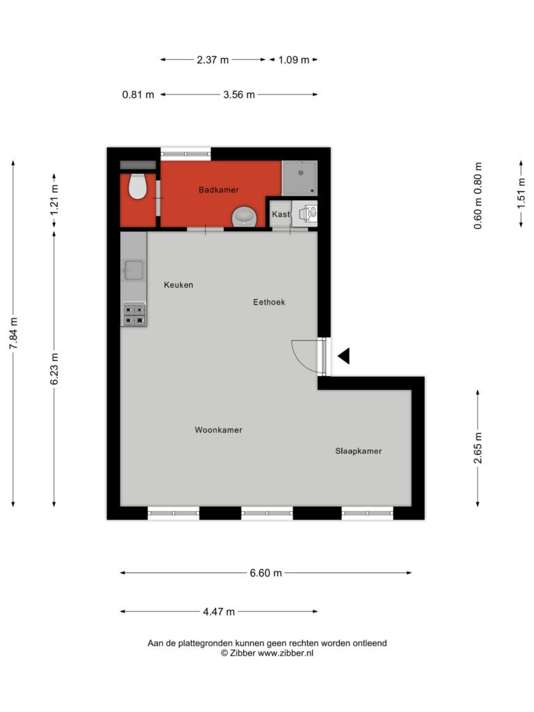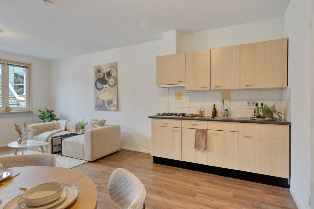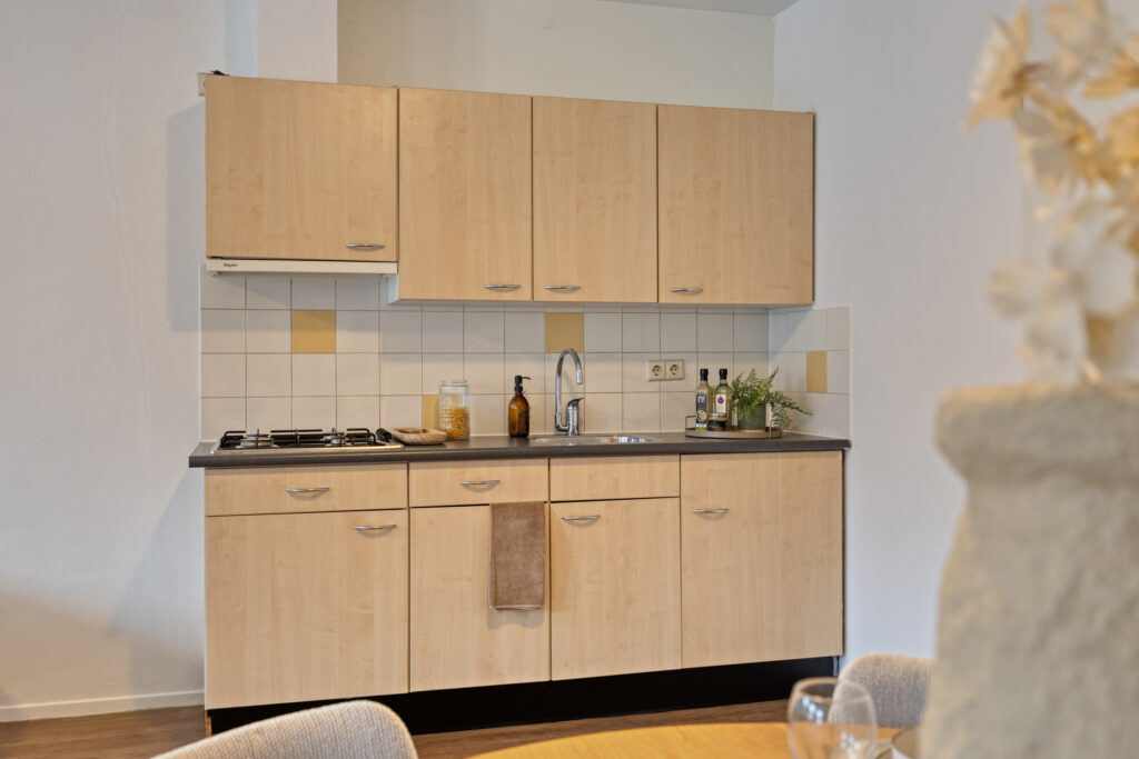In het midden van de studio vind je de lichte woon en eetkamer met verschillende indelingsmogelijkheden. De keuken staat centraal en is uitgerust met een kunststof werkblad, vierpits gaskookplaat, afzuigkap, koelkast en voldoende opbergruimte.