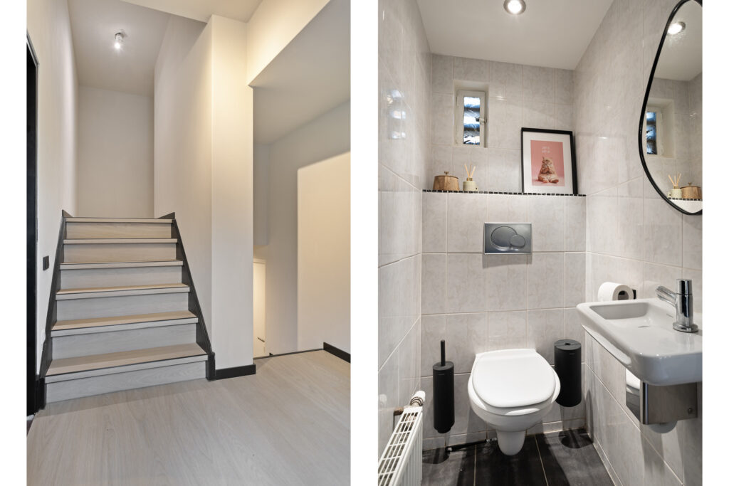 De toiletruimte is volledig betegeld en is voorzien van zwarte accenten en inbouwspots, wat direct een luxe uitstraling geeft.