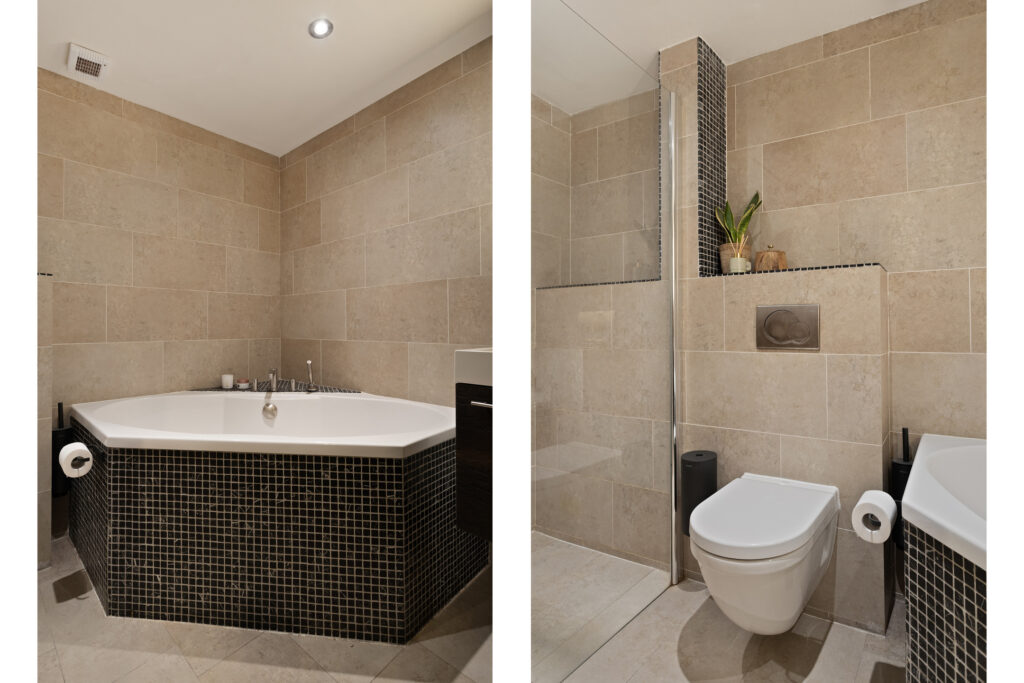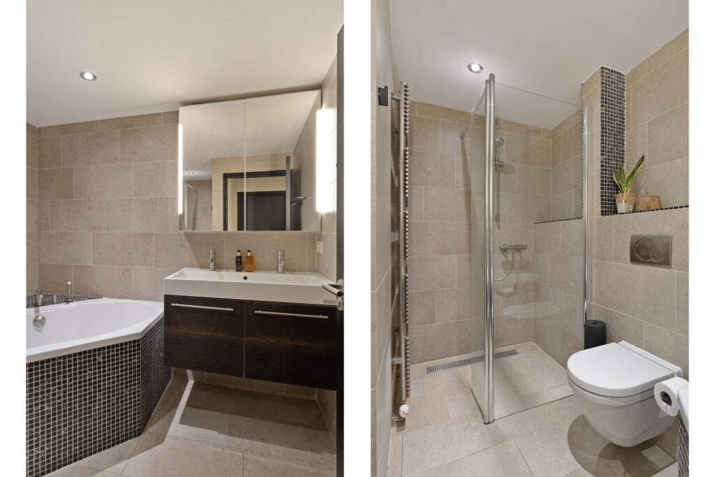 De badkamer is volledig betegeld en voorzien van een dubbele wastafel in meubel, ruim ligbad, inloopdouche, toilet, designradiator, inbouwspots en mechanische ventilatie.