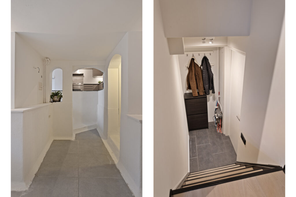 U betreedt de woning via een ruime hal. Vanuit hier heeft u toegang tot de toiletruimte, de meterkast, de trap naar de eerste verdieping en de trap naar het souterrain.