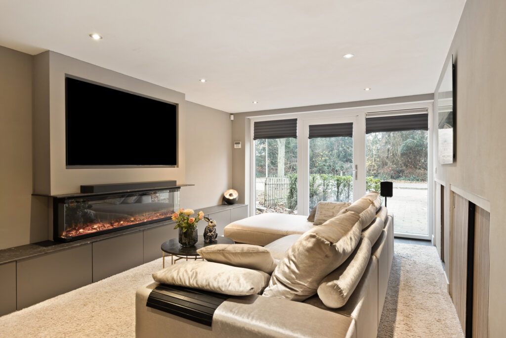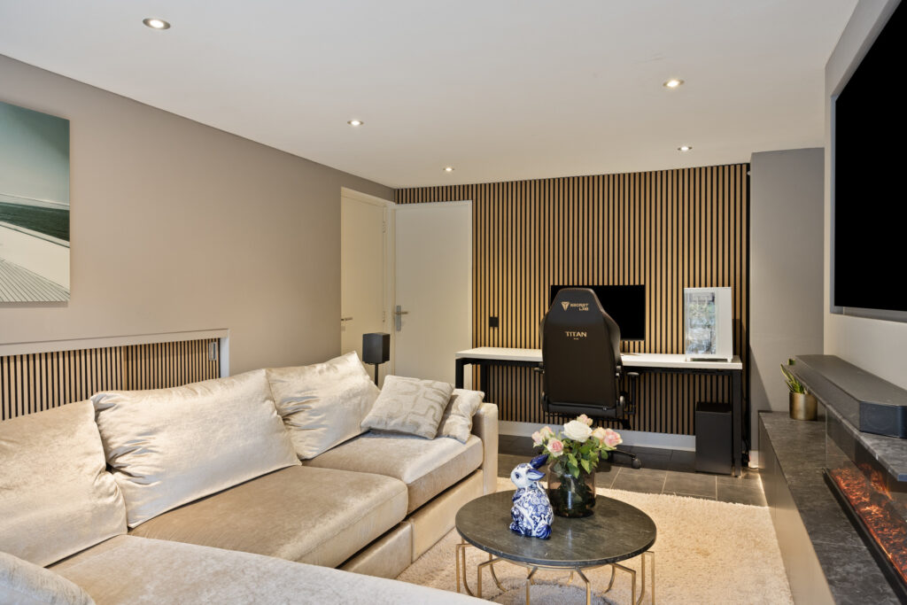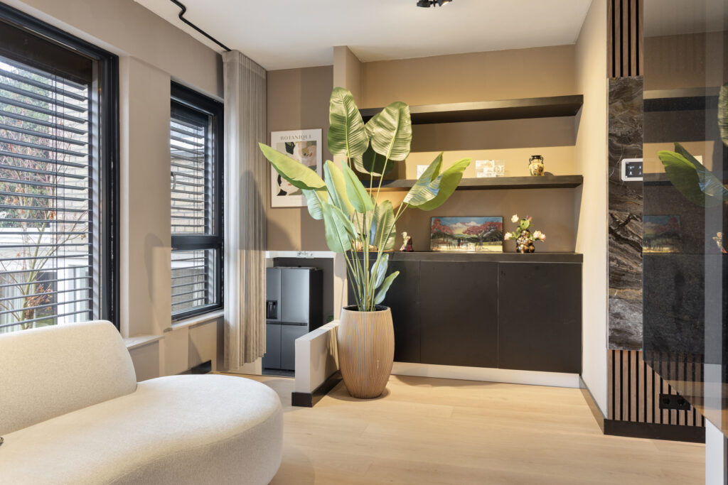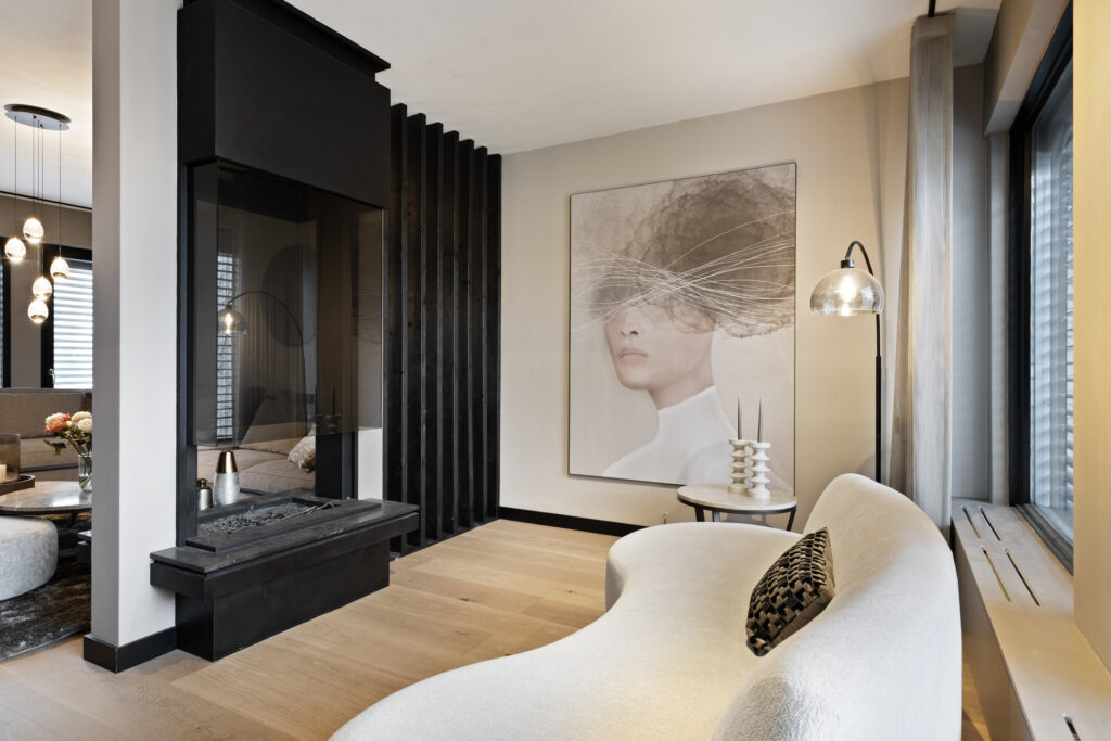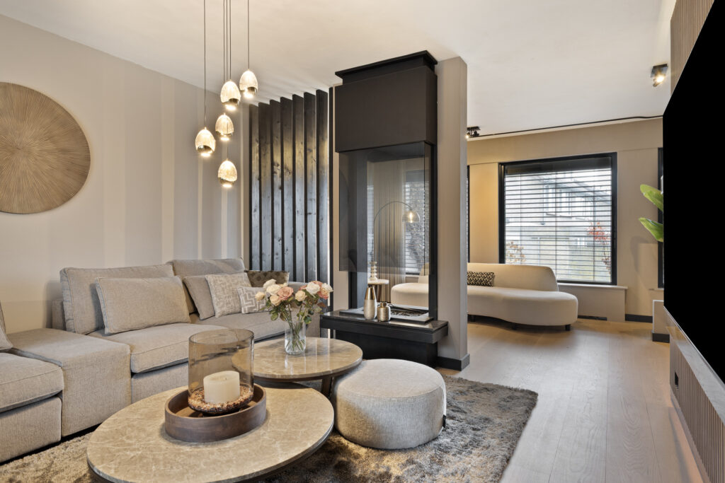 U komt binnen in de ruime, moderne woonkamer die direct sfeer en warmte uitstraalt. De houten vloer vormt samen met de zwarte kozijnen en buiten jaloezieën een stijlvol geheel. Een prachtige houthaard van Boley verdeelt subtiel de ruimte en zorgt voor een warme, uitnodigende ambiance, perfect voor koude dagen en donkere avonden. De woonkamer biedt voldoende plaats voor meerdere zitopstellingen en is bovendien voorzien van een maatwerk cinemawall.