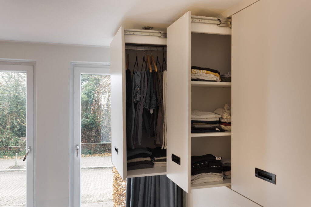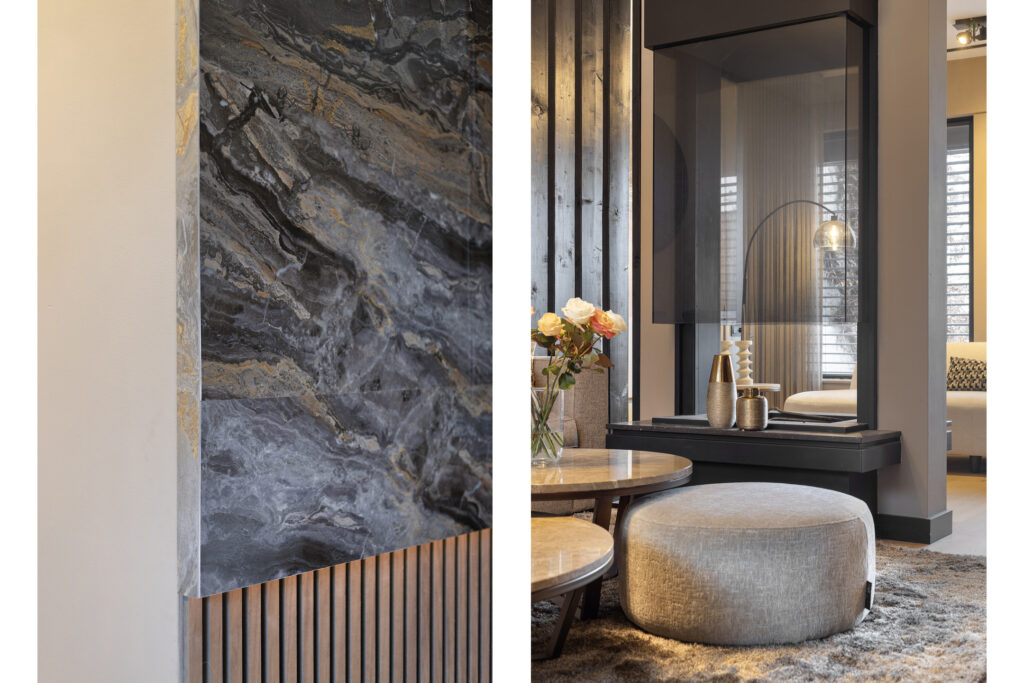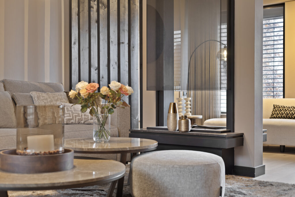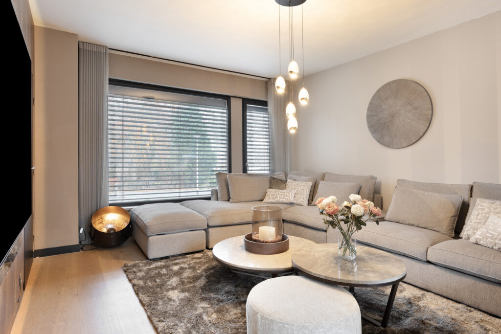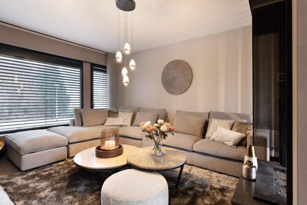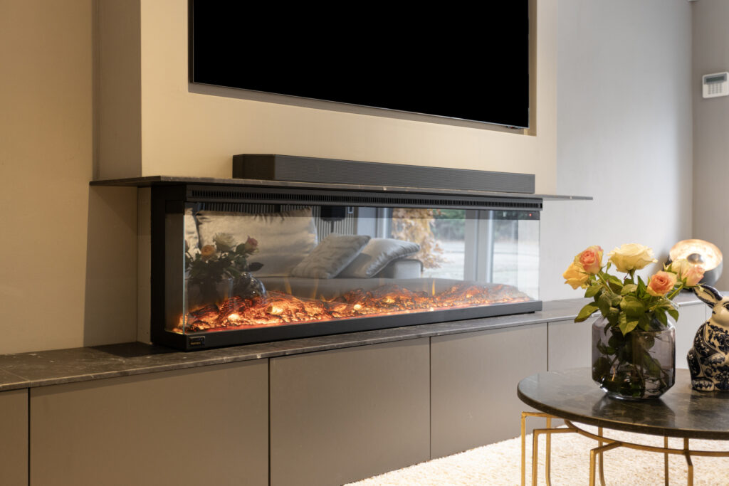 U komt binnen in de ruime, moderne woonkamer die direct sfeer en warmte uitstraalt. De houten vloer vormt samen met de zwarte kozijnen en buiten jaloezieën een stijlvol geheel. Een prachtige houthaard van Boley verdeelt subtiel de ruimte en zorgt voor een warme, uitnodigende ambiance, perfect voor koude dagen en donkere avonden. De woonkamer biedt voldoende plaats voor meerdere zitopstellingen en is bovendien voorzien van een maatwerk cinemawall.
