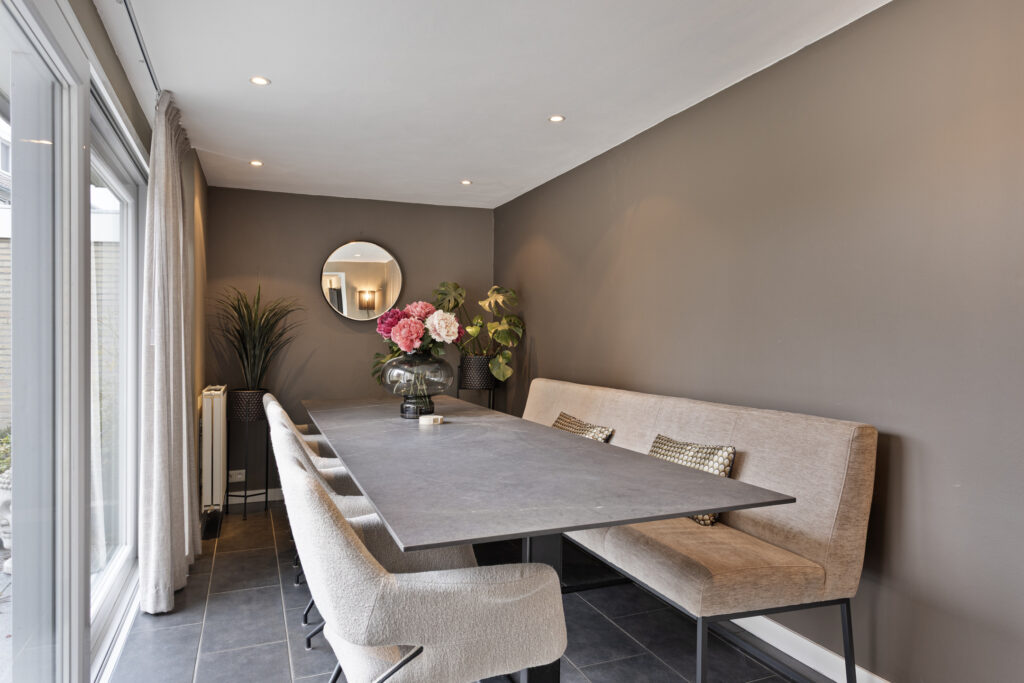Aan de achterzijde bevindt zich de royale eetkamer met grote schuifpui naar de tuin. Afgewerkt met inbouwspots en ruim genoeg voor een grote eettafel, is dit de perfecte plek voor gezellige diners en lange avonden met familie en vrienden.