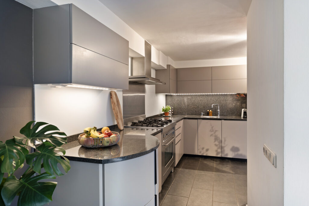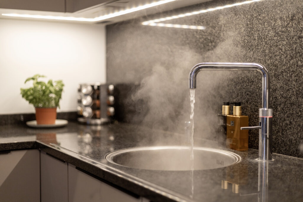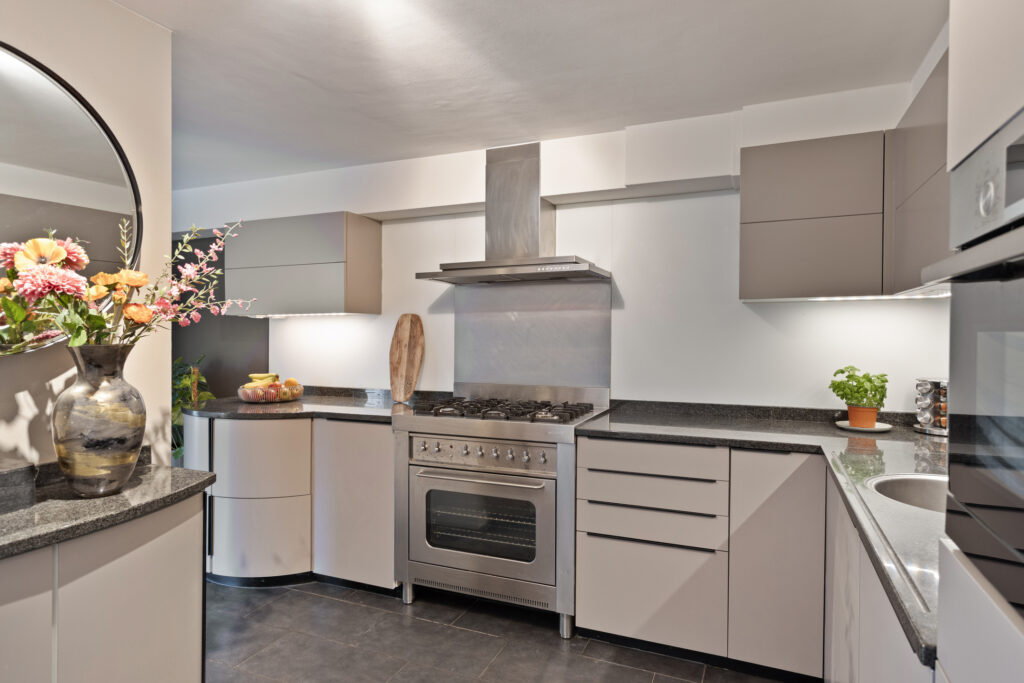 De royale leefkeuken met apparatuur van Gaggenau is een absolute blikvanger. Uitgevoerd in een moderne beige kleurstelling en voorzien van een antraciet tegelvloer met vloerverwarming, combineert deze keuken stijl en comfort op perfecte wijze. De keuken is volledig uitgerust met een composiet werkblad, 6-pits gasfornuis met oven, afzuigkap, Quooker, vaatwasser, combi-oven/magnetron en een losse Amerikaanse koel-/vriescombinatie. In het hart van de ruimte zorgt een open haard voor een warme, gezellige sfeer en biedt het een prachtig uitzicht op de tuin.