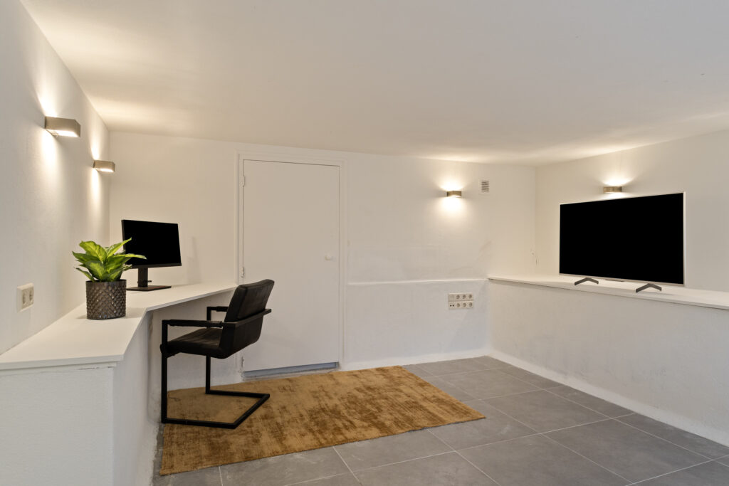 Vanuit de keuken loopt u door naar een royale, multifunctionele ruimte met een eigen entree. Deze veelzijdige ruimte is ideaal te gebruiken als kantoor of praktijk aan huis, gastenverblijf of hobbykamer. De ruimte is modern en stijlvol afgewerkt met een antracietkleurige tegelvloer voorzien van vloerverwarming, inbouwspots en maatwerkkasten. Daarnaast is er een op maat gemaakte cinemawall aanwezig met een soundbarinstallatie, welke ter overname wordt aangeboden. Ook vindt u hier de aansluiting voor de wasmachine.