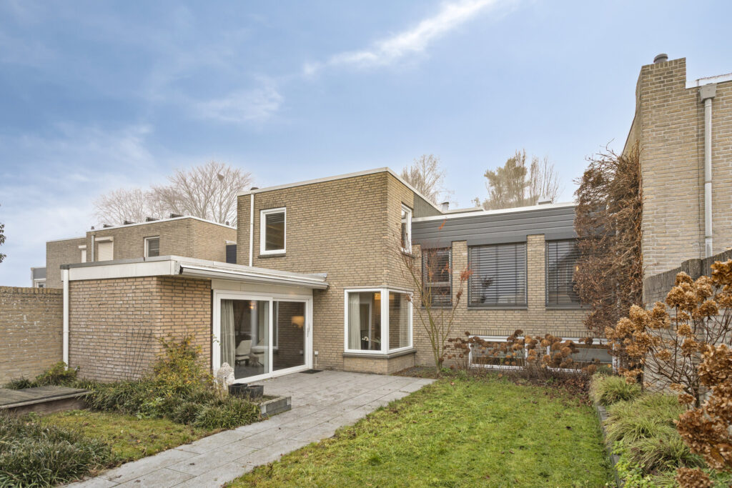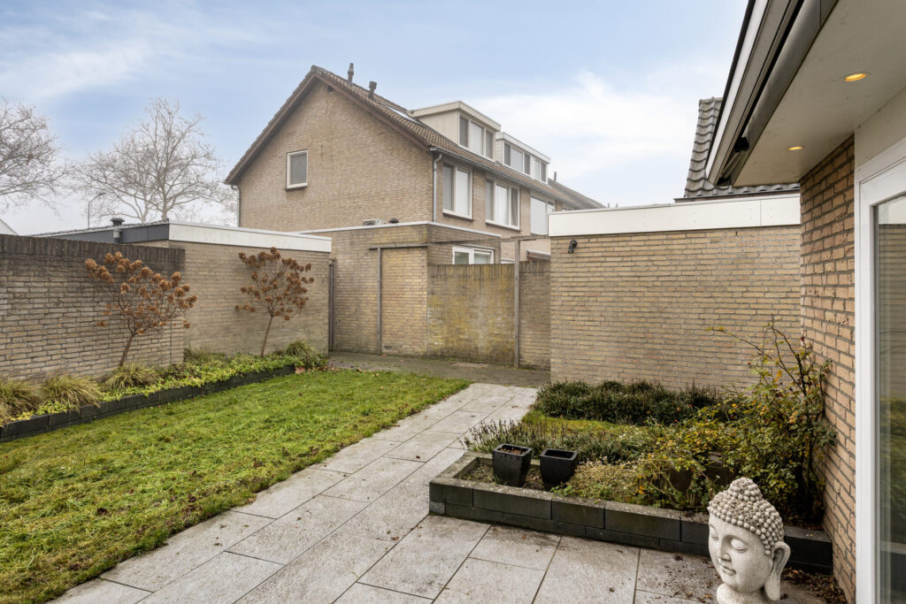 De achtertuin is ruim en groen ingericht, met een gazon, volwassen beplanting en sierbestrating. Achterin staat een stenen berging, ideaal voor het stallen van fietsen, gereedschap of andere spullen.