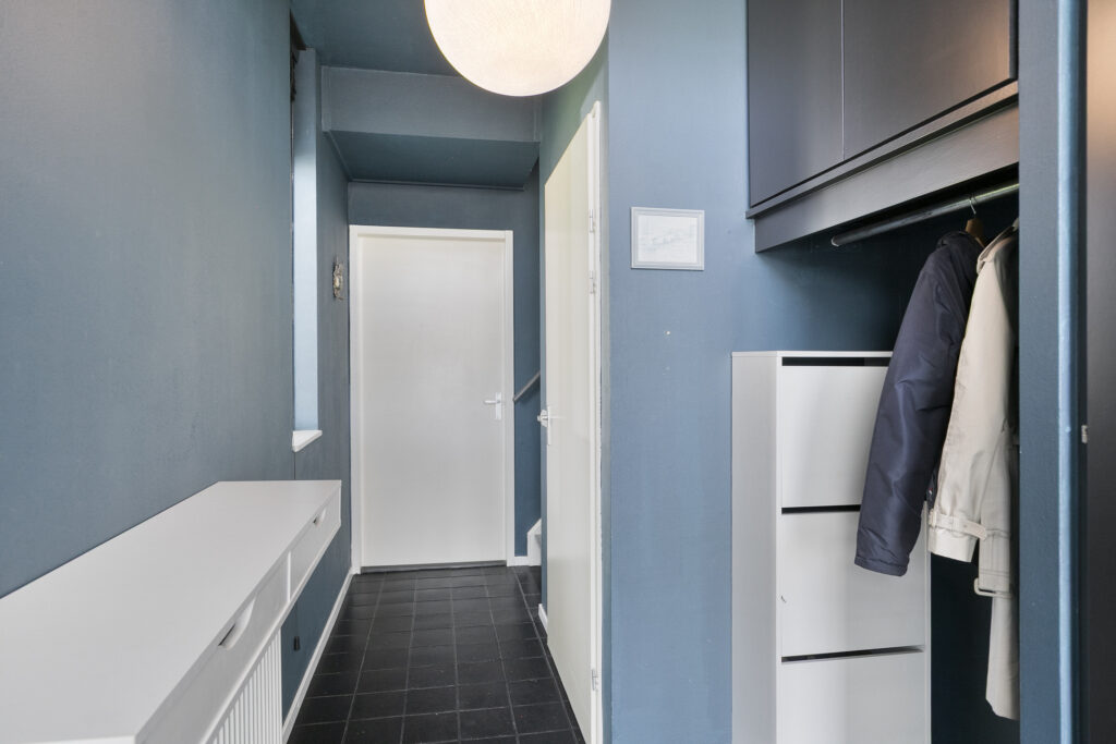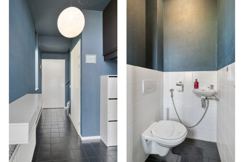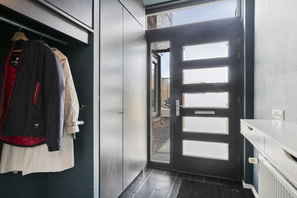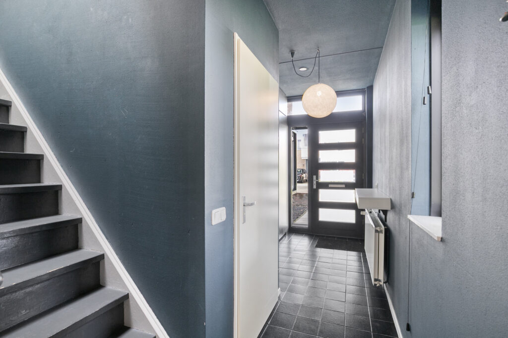 Via de strak aangelegde voortuin is de overdekte entree te bereiken. In de hal, voorzien van een donkere tegelvloer, bevinden zich de meterkast, de trapopgang naar de eerste verdieping en de moderne toiletruimte met een wandcloset, een fonteintje en een handbidet. Tevens zijn in de hal de garderobe en vaste inbouwkasten aanwezig.