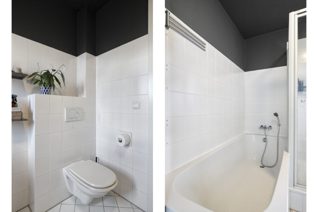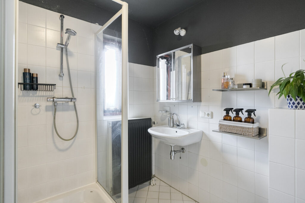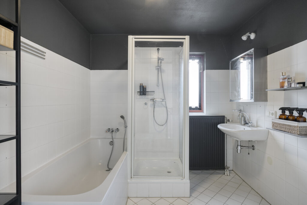 De licht betegelde en complete badkamer is uitgerust met een ligbad, een douchecabine, een wandcloset en een wastafel.