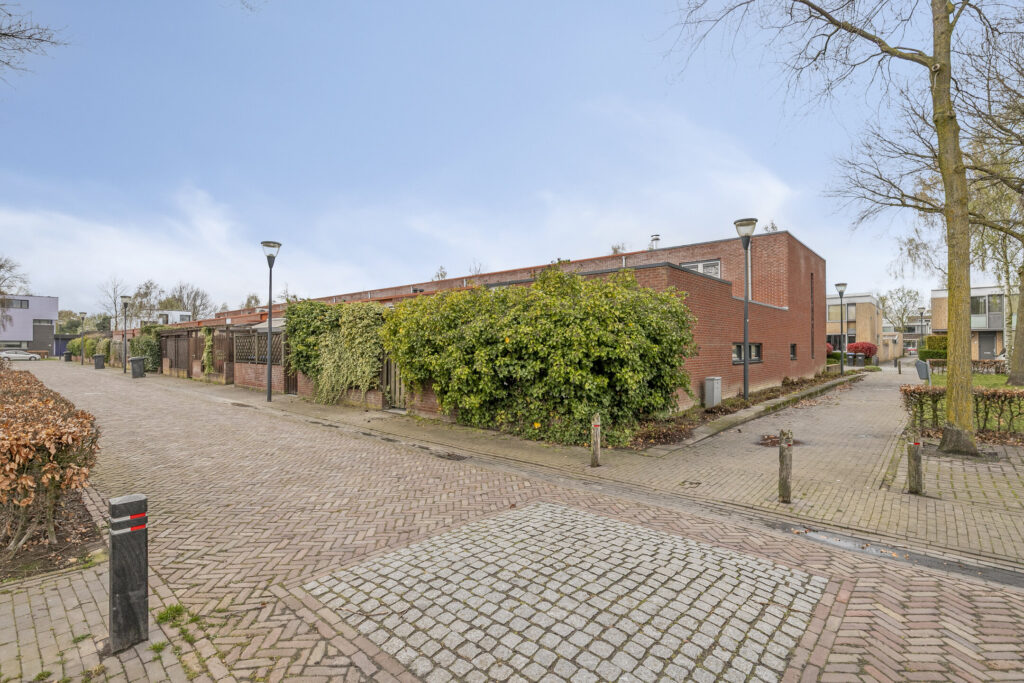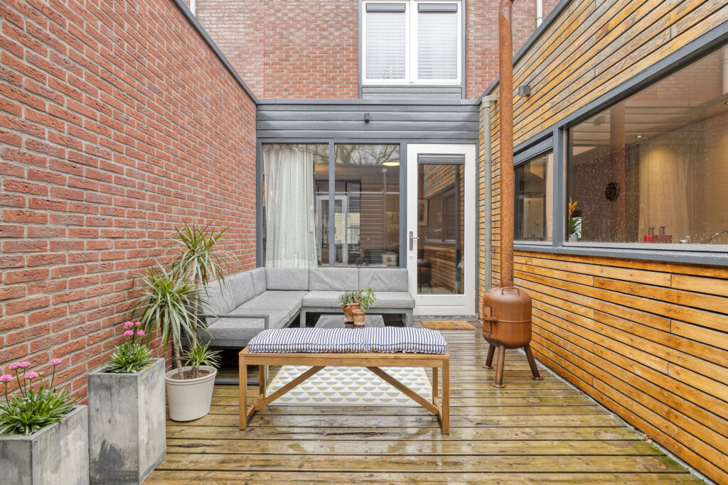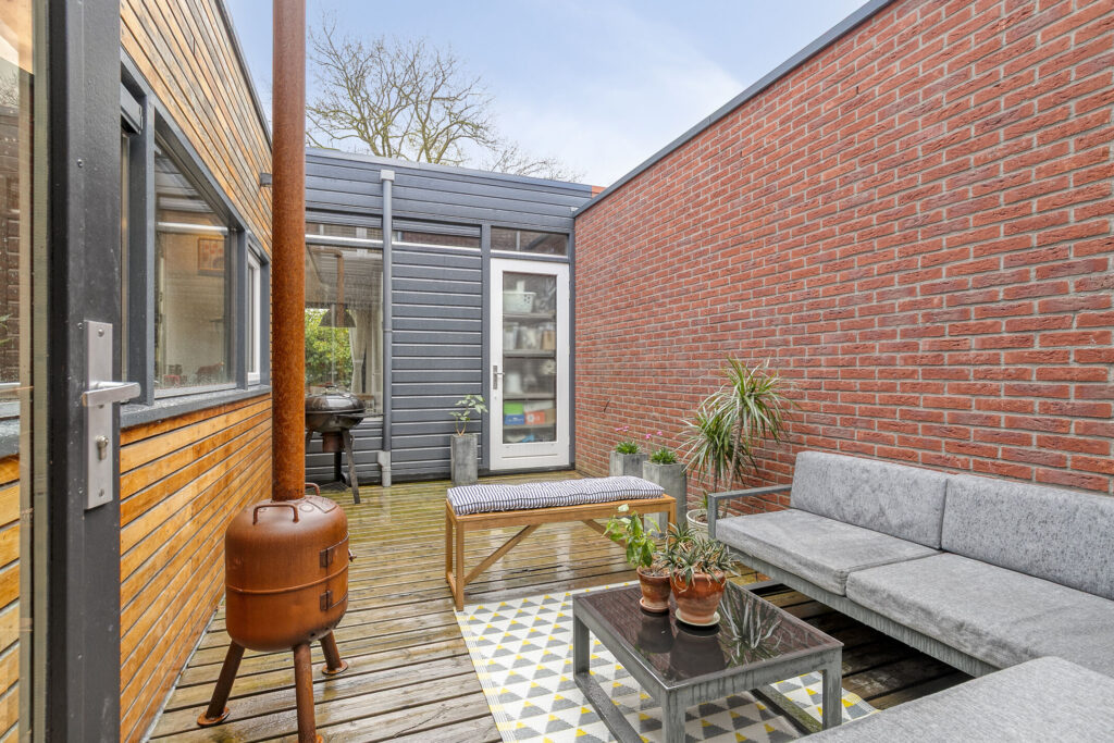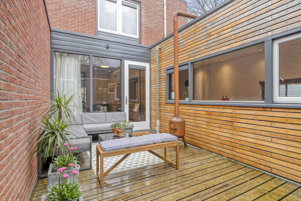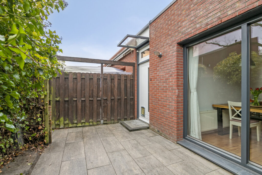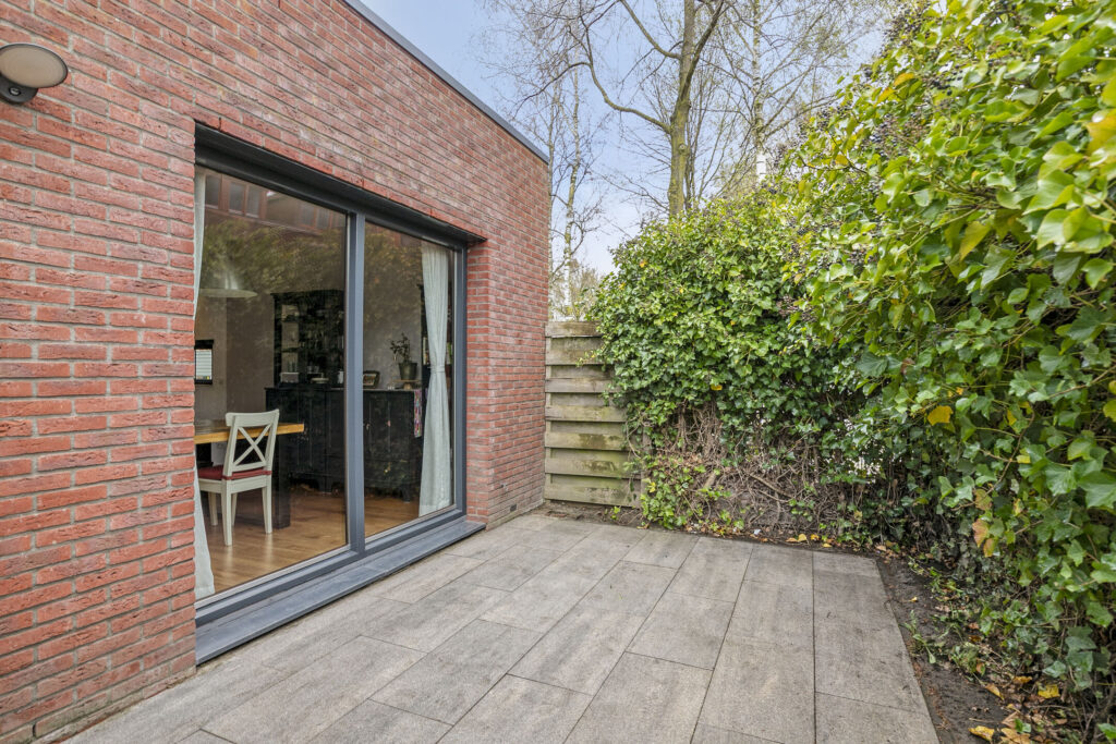De woning beschikt over meerdere buitenruimtes, wat zorgt voor een unieke woonbeleving. Aan de voorzijde ligt een strak aangelegde voortuin. Centraal is een fijne patiotuin met houten vlonders gelegen, een heerlijke plek met veel privacy waar je beschut kunt zitten. De achtertuin is onderhoudsvriendelijk aangelegd met bestrating en heeft geen directe achterburen. Er is een poort naar de achtergelegen straat met alleen bestemmingsverkeer en waar je uitkijkt op een speeltuintje. Een ideale plek waar je kinderen veilig kunnen spelen. Op ieder moment van de dag is er dus wel een fijne plek in de zon of schaduw te vinden.