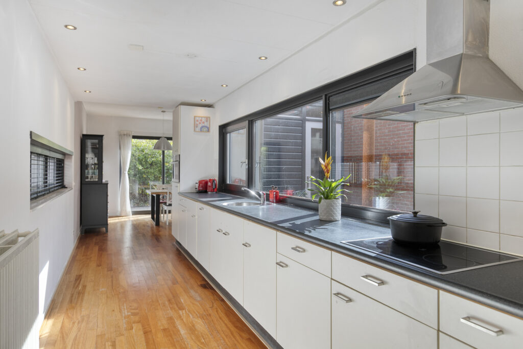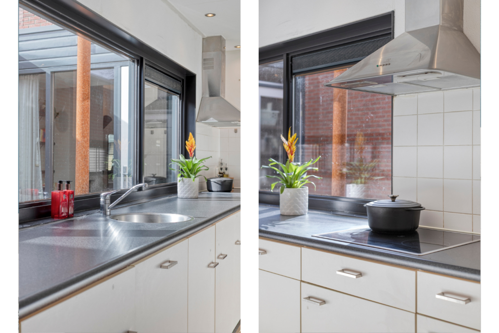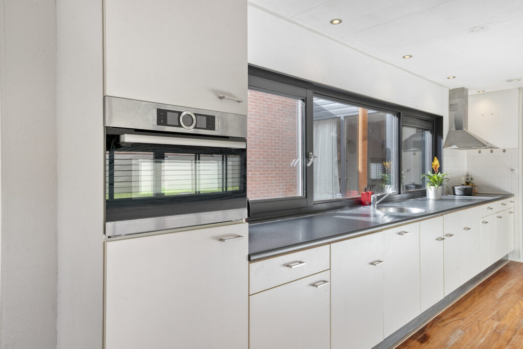 De open keuken ligt centraal in de woning en vormt het hart van het huis. De lichte en moderne keukeninrichting is ruim opgezet en is voorzien van een ronde spoelbak, inductiekookplaat, afzuigkap, vaatwasser (vernieuwd in november 2025), combi-oven (vernieuwd in april 2023) en een koelkast. Daarnaast is er volop bergruimte aanwezig. Door de centrale ligging heb je contact met zowel de woonkamer, patiotuin en eetkamer, wat het een fijne leefkeuken maakt.