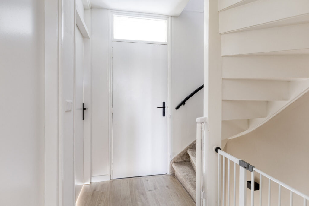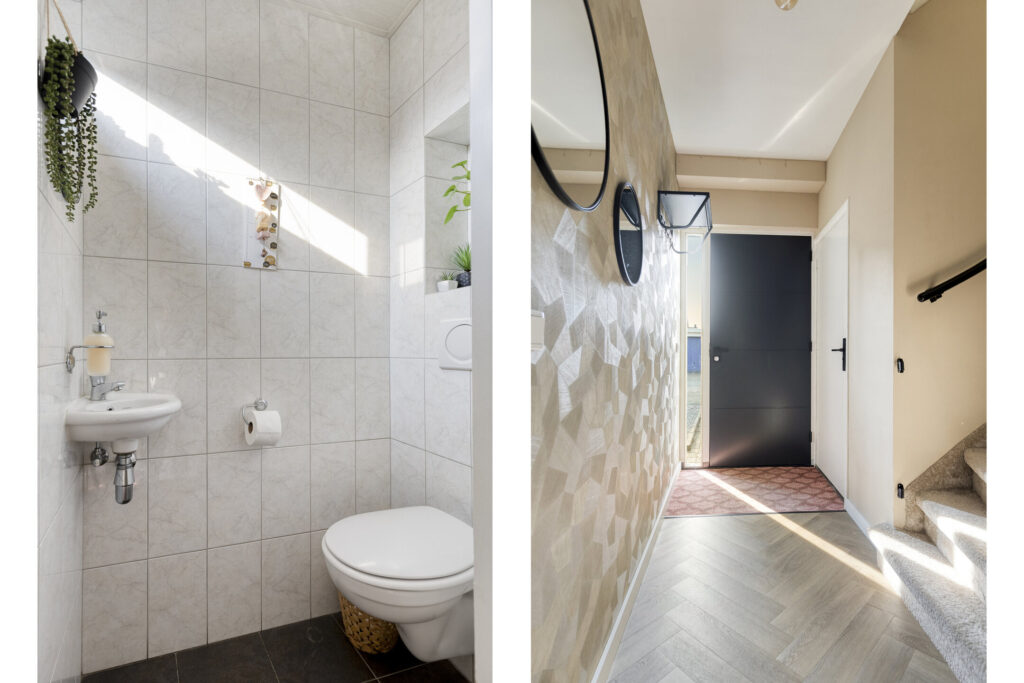 Via de onderhoudsvriendelijke voortuin bereik je de entree van de woning. In de hal bevinden zich de betegelde toiletruimte met een wandcloset en fonteintje, de trapopgang naar de eerste verdieping en een praktische trapkast met een vernieuwde meterkast.