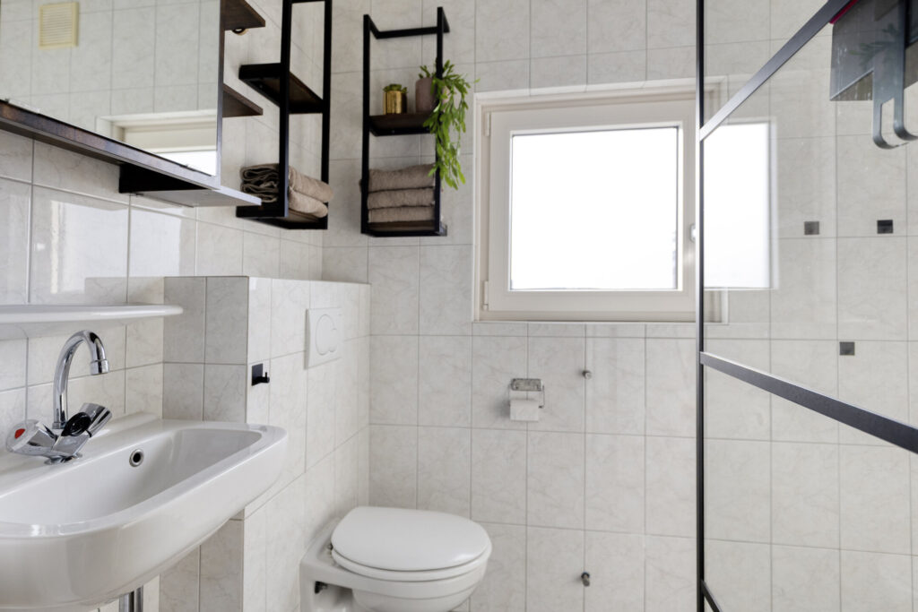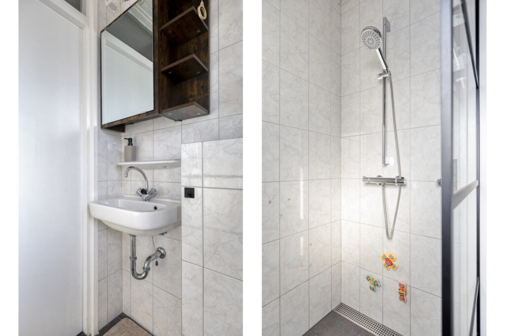 De badkamer ligt aan de voorzijde, is volledig betegeld en is uitgerust met een ruime inloopdouche met een thermostaatkraan, een wastafel en een wandcloset.