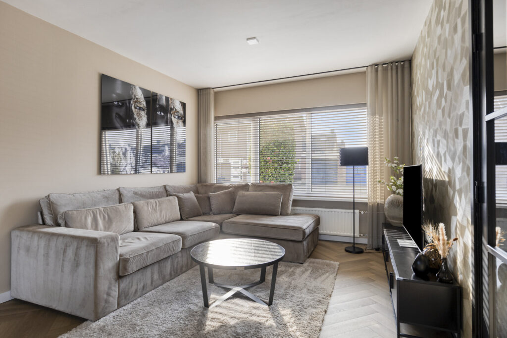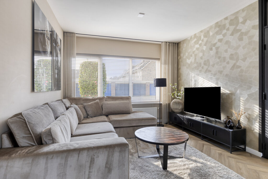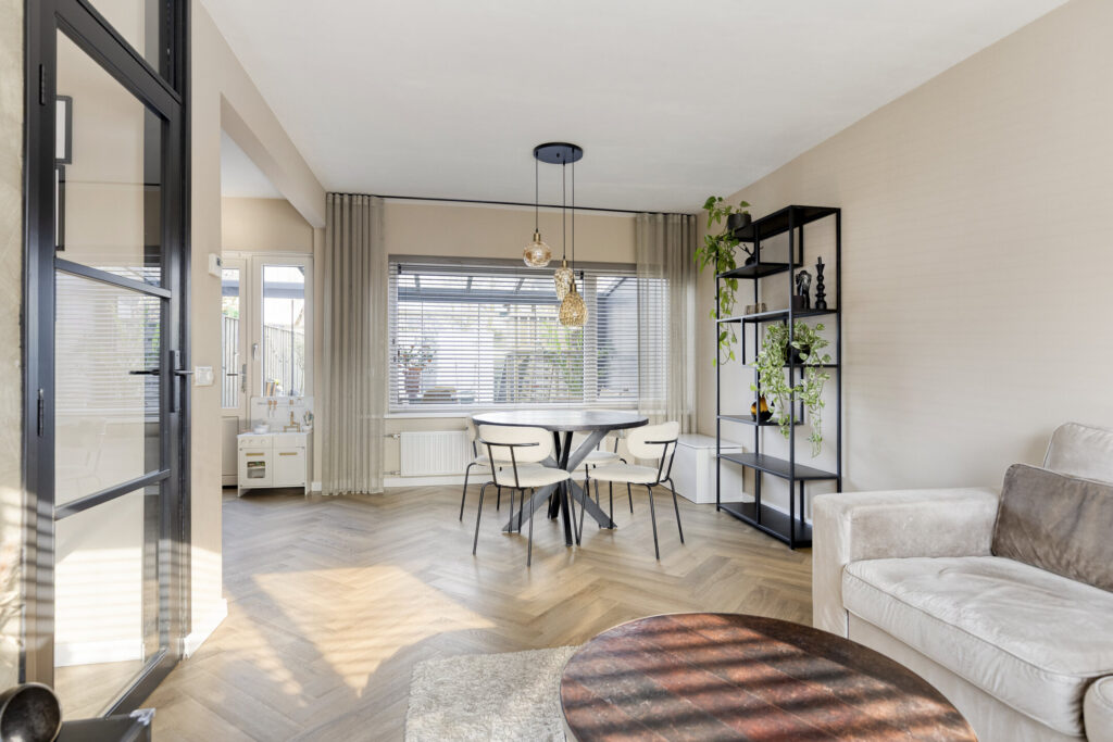De stijlvolle zwarte glazen deur geeft toegang tot de woonkamer. Hier valt direct het prettige lichtinval op dankzij de grote raampartijen aan zowel de voor- als achterzijde. De woonkamer is afgewerkt met een fraaie visgraat PVC-vloer en strak gestucte wanden.