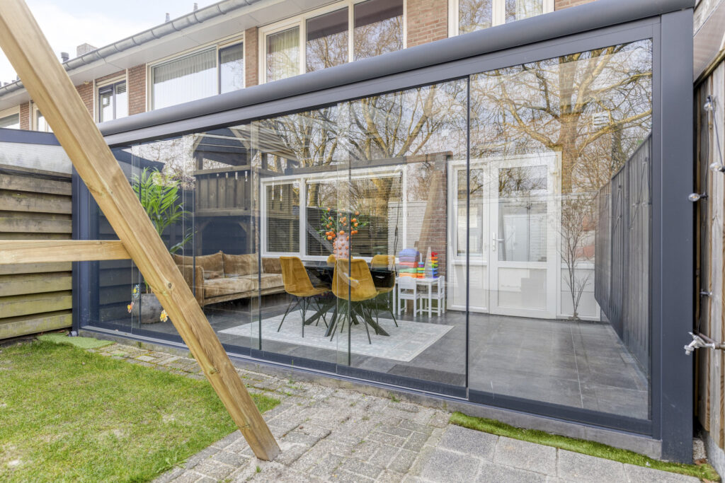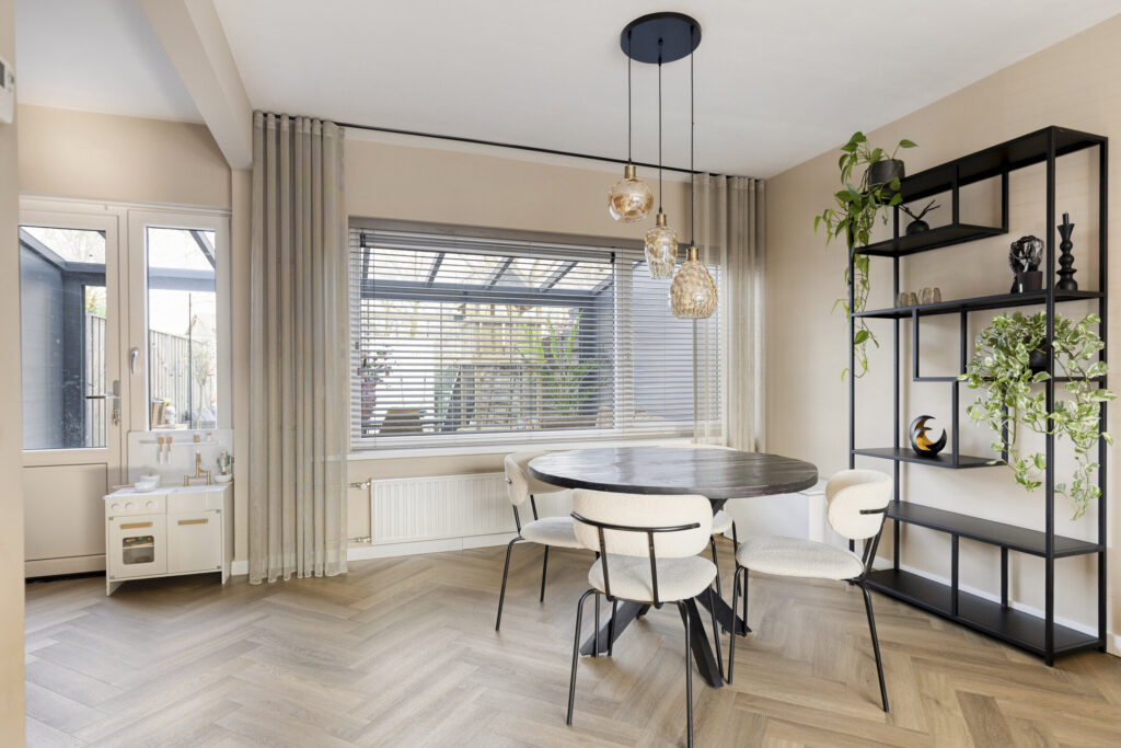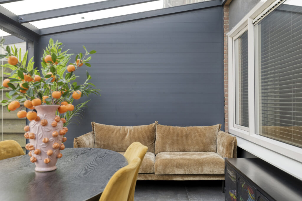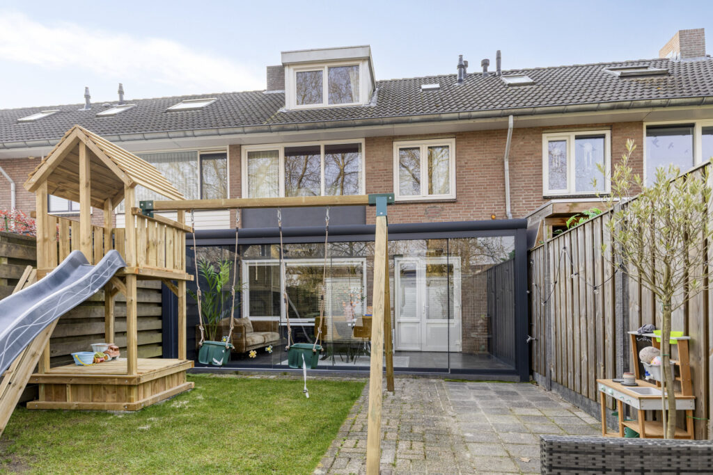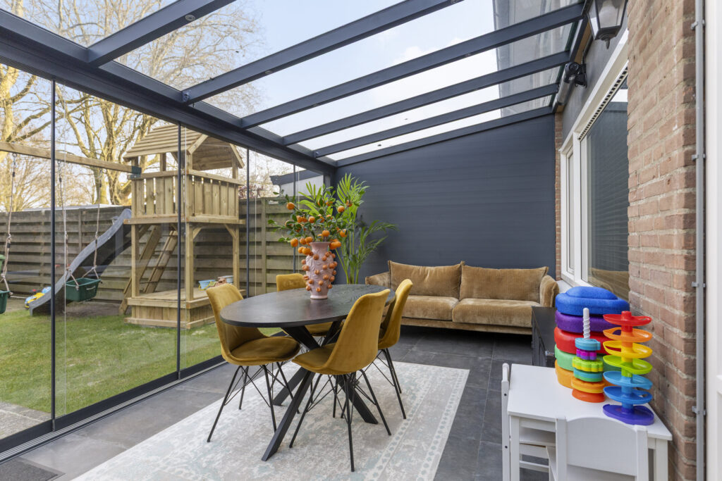 Aan de achterzijde is de woning uitgebouwd met een tuinkamer, die als volwaardige verlenging van de woonkamer dient. Deze ruimte is voorzien van vloertegels, inbouwspots en glazen schuifwanden, waardoor je het buitengevoel optimaal naar binnen haalt.