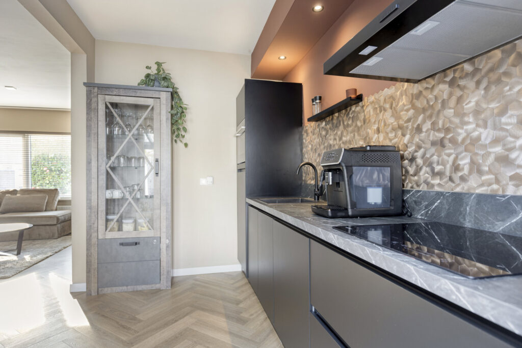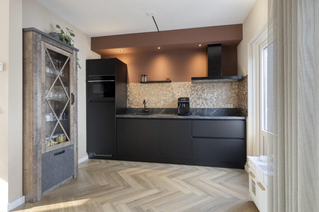 De open keuken in een wandopstelling is modern uitgevoerd en is voorzien van diverse inbouwapparatuur, waaronder een inductiekookplaat met afzuigkap, vaatwasser, combi-oven en koelkast. Vanuit de keuken heb je direct toegang tot de tuinkamer en de achtertuin.
