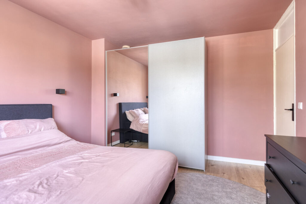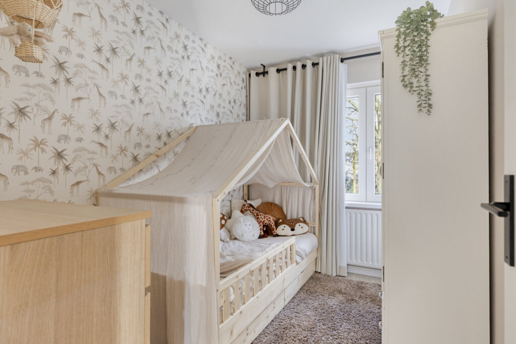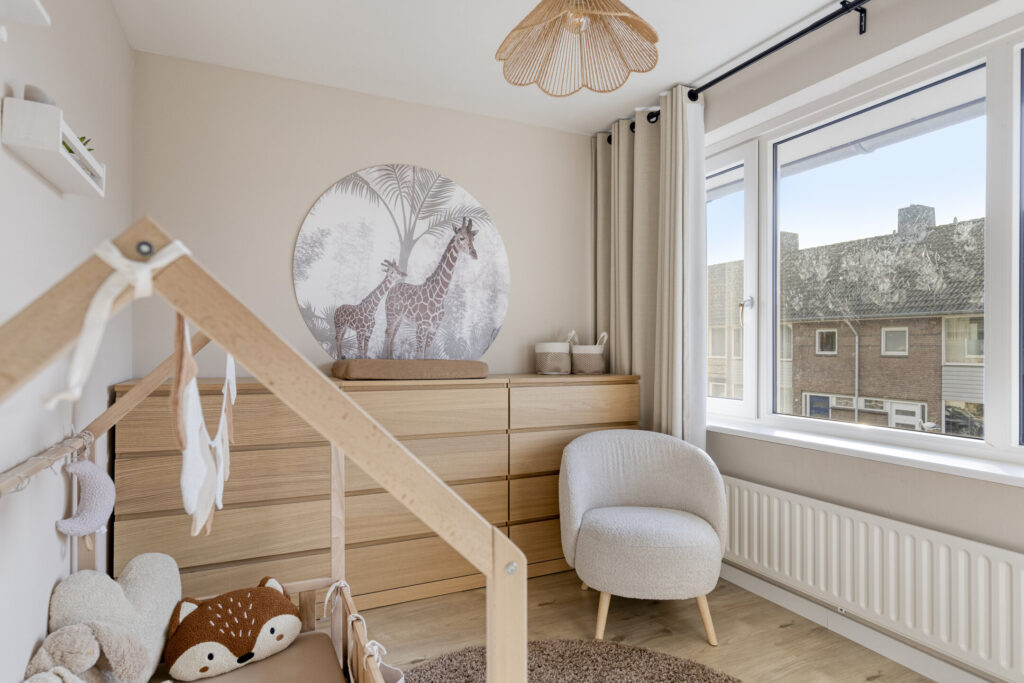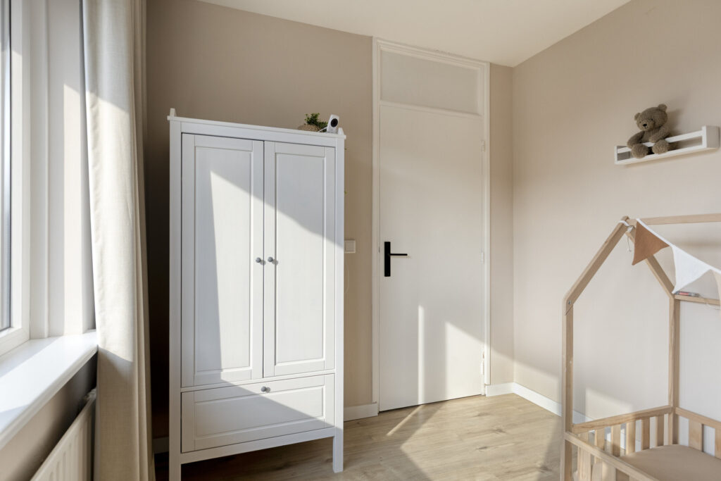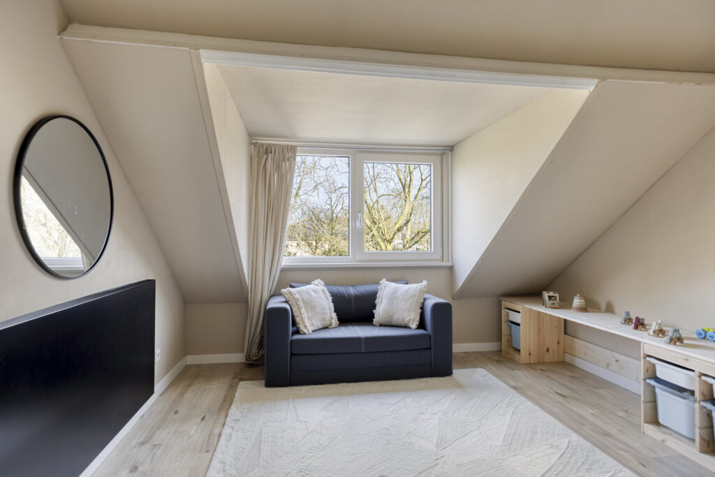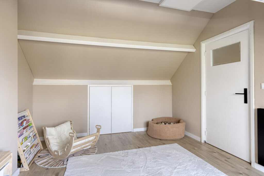 De vierde slaapkamer is royaal en voorzien van een dakkapel aan de achterzijde, wat zorgt voor extra ruimte en comfort. Ook hier zijn de wanden strak afgewerkt en ligt er een laminaatvloer.