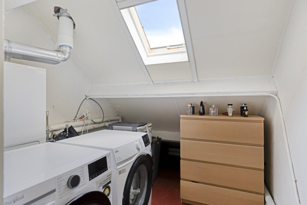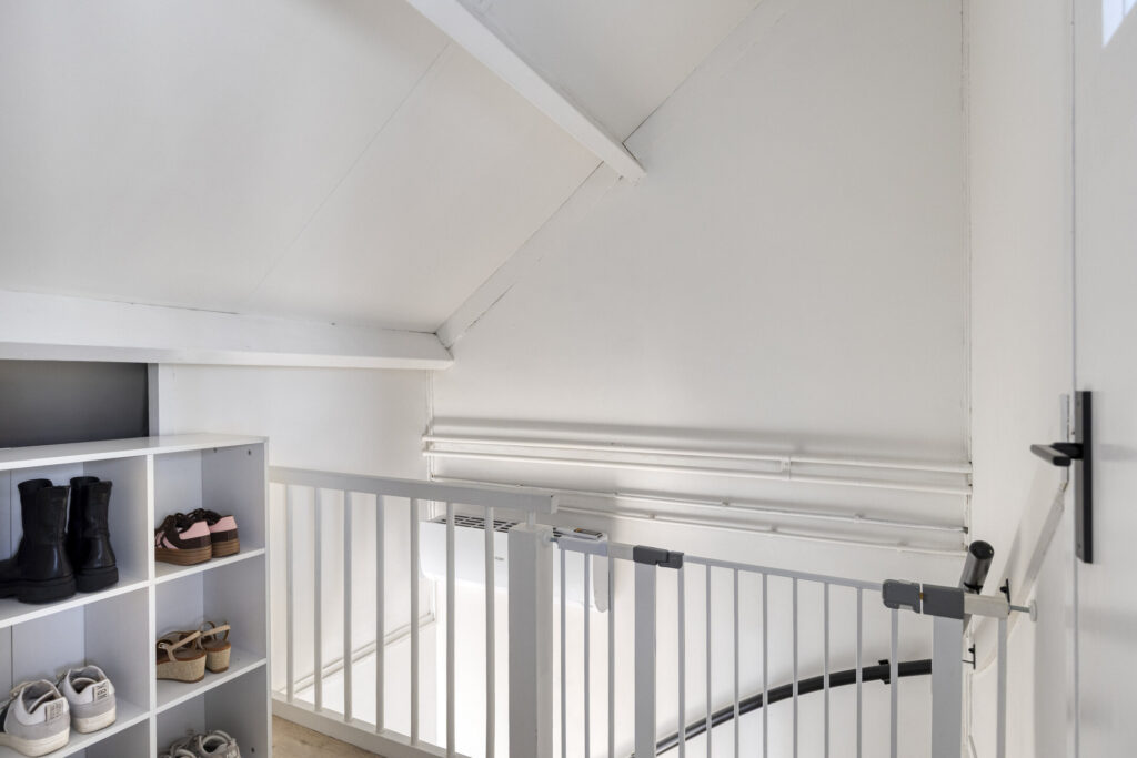 Via een vaste trap bereik je de tweede verdieping. Op de voorzolder bevinden zich de opstelling van de c.v.-ketel, extra bergruimte en een dakraam voor natuurlijke lichtinval. Tevens is in het trappengat een airco-unit aanwezig.