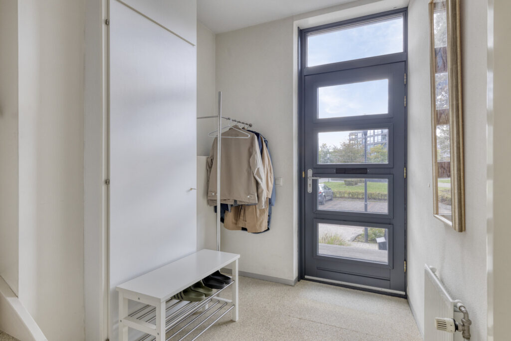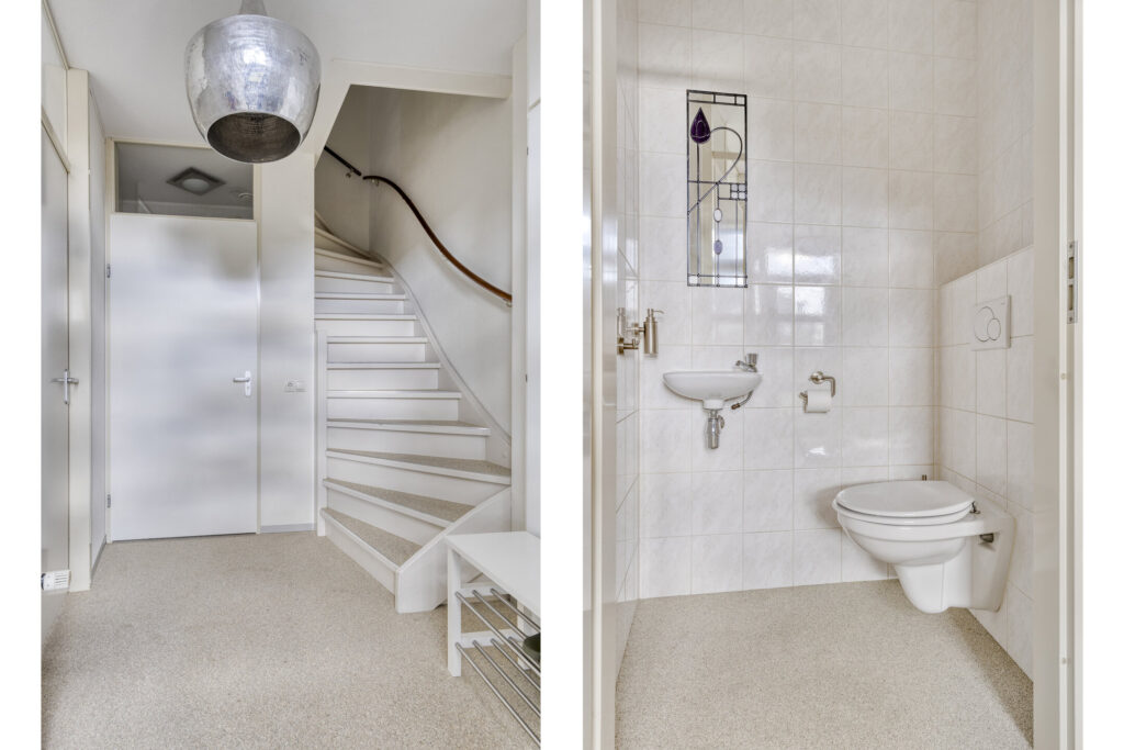 U komt binnen in de ruime en vooral lichte hal van de woning. Hier vindt u de garderobe, de meterkast en een modern afgewerkt toilet met wastafel en zwevend closet. De gehele begane grond is voorzien van een onderhoudsvriendelijke grindvloer die de woning een strakke en eigentijdse uitstraling geeft.