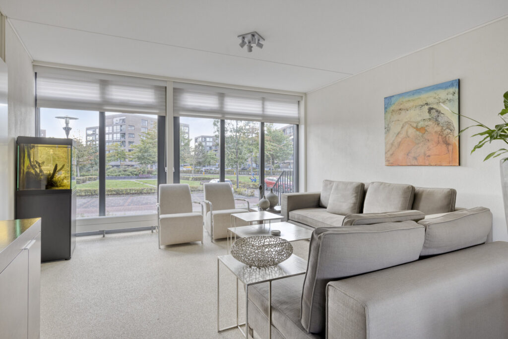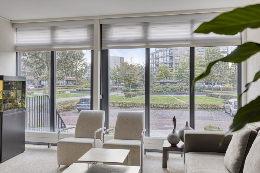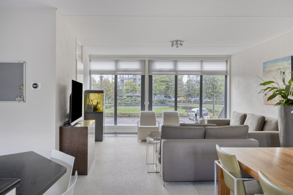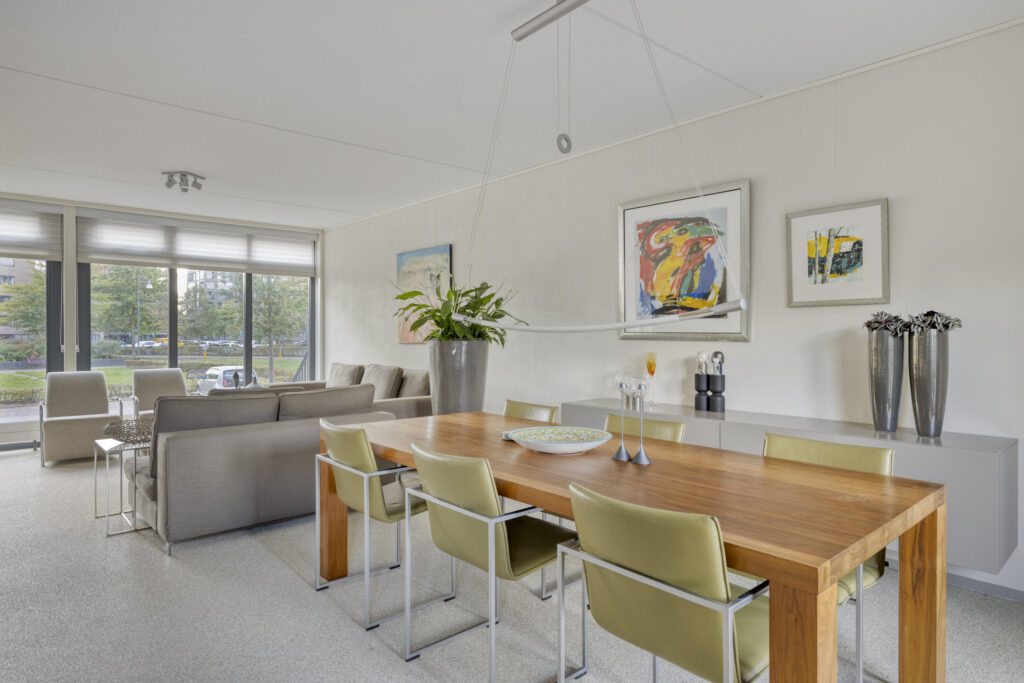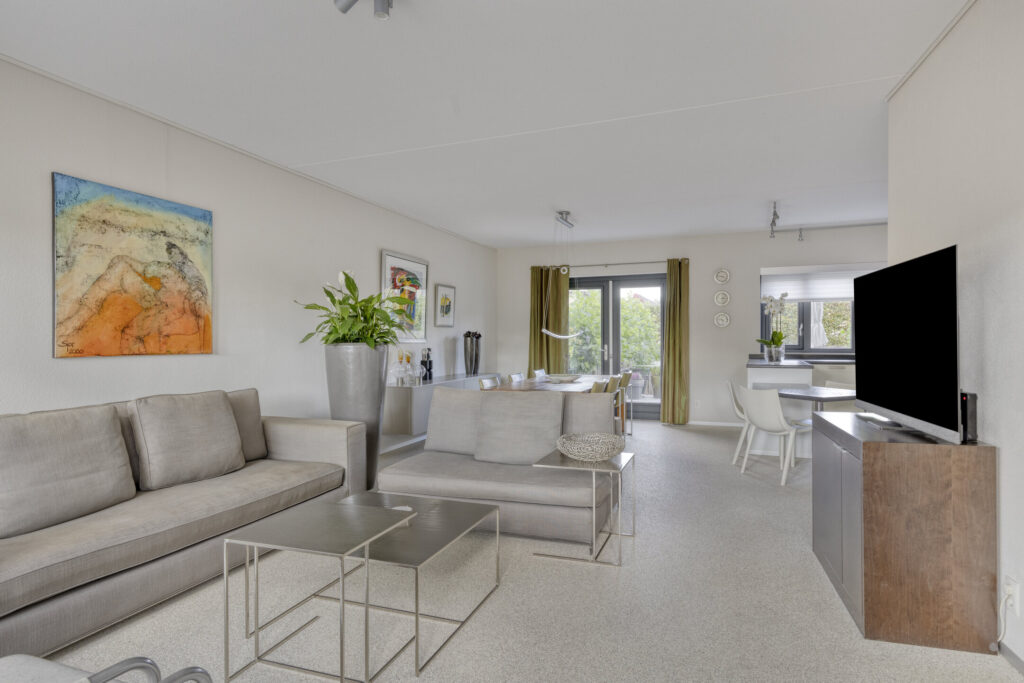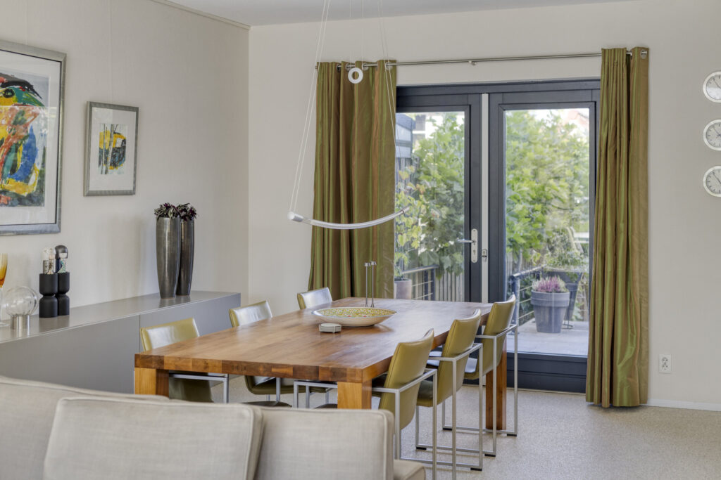 Vanuit de hal bereikt u de woonkamer. Deze valt direct op door de plafondhoge ramen aan de voorzijde, die zorgen voor een prachtige lichtinval. De royale woon- en eetkamer is afgewerkt met strak stucwerk en beschikt over openslaande deuren naar de verhoogde achtertuin. Een ideale plek om te ontspannen en te genieten van het uitzicht op groen en eigen buitenruimte. Ook is de woonkamer voorzien van vloerverwarming