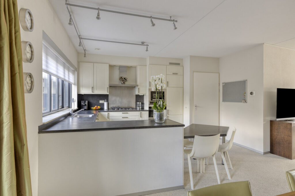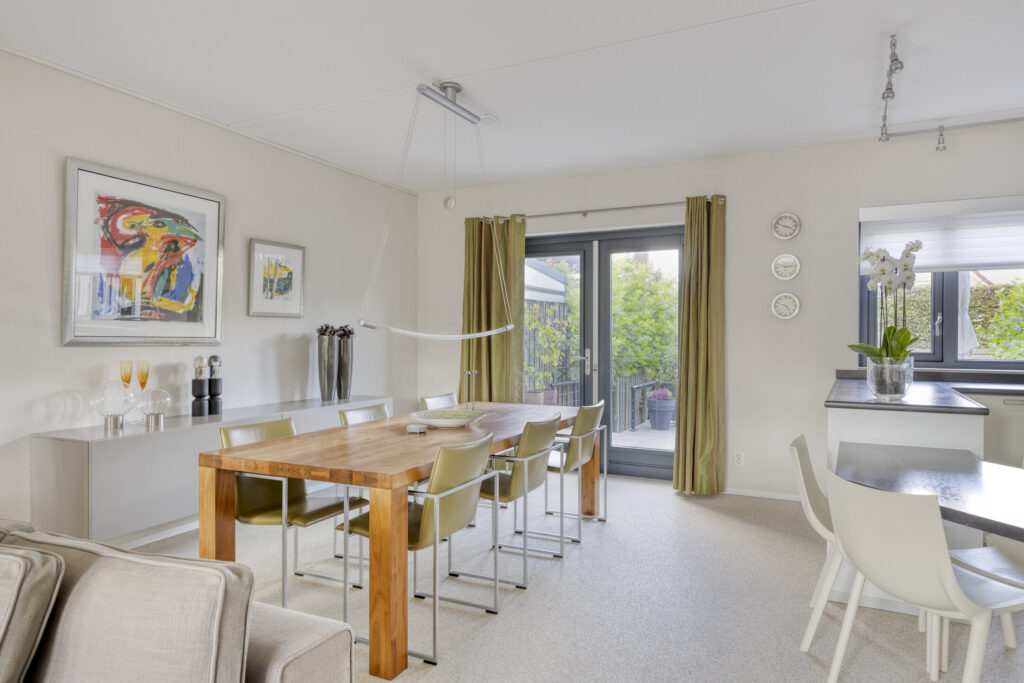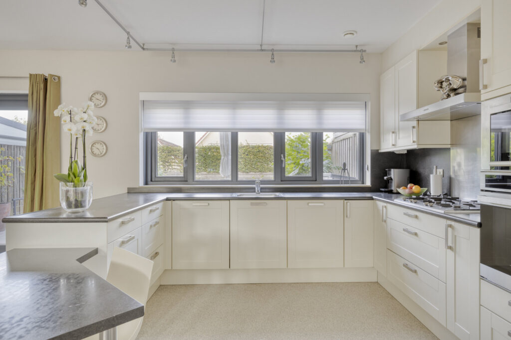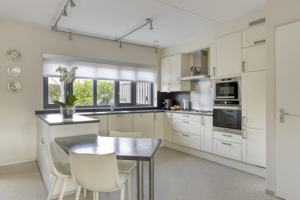 De keuken bevindt zich aan de achterzijde van de woning en is uitgevoerd in een ruime L-opstelling met een praktische bar, perfect voor een snel ontbijt of een gezellig drankje. U beschikt hier over een kunststof werkblad en diverse inbouwapparatuur, waaronder een gasfornuis met wokbrander, afzuigkap, oven, magnetron en koelkast. Vanuit de keuken heeft u bovendien inpandige toegang tot het souterrain.