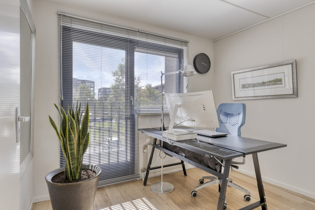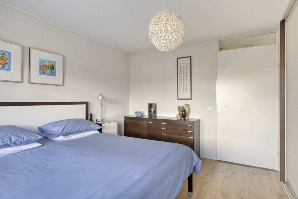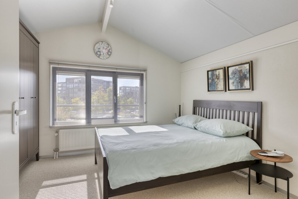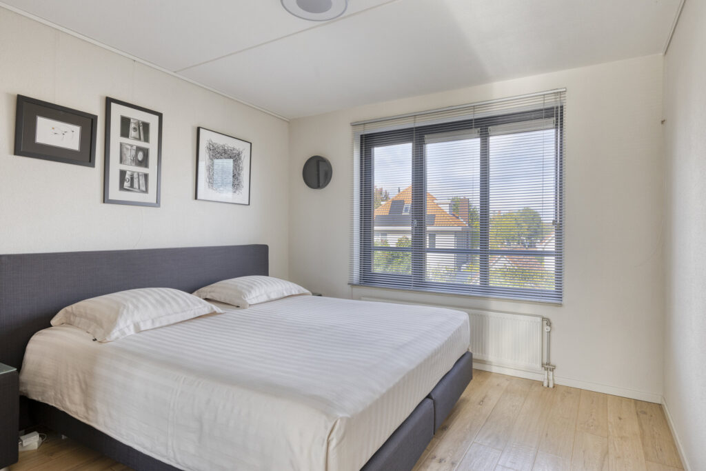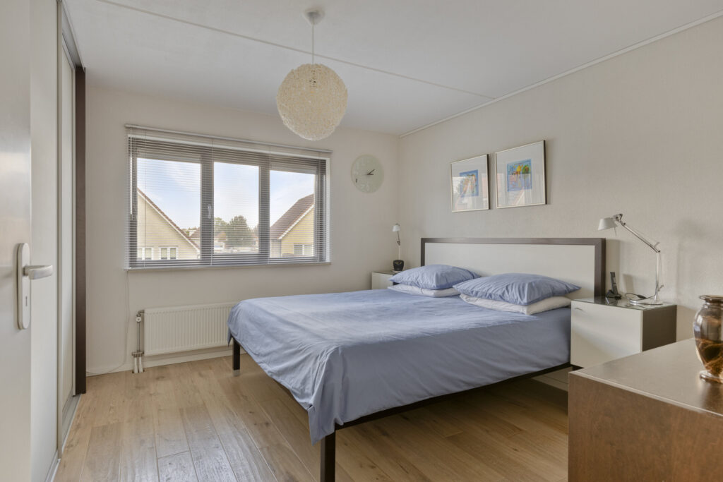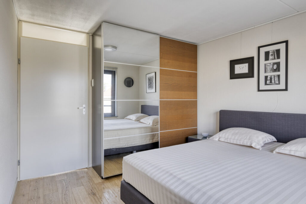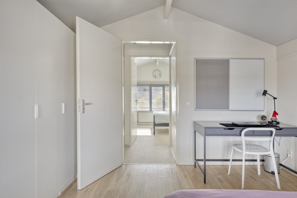 Daarnaast ligt er aan de achterzijde nog een ruime slaapkamer, die dankzij het royale formaat uitstekend geschikt is als kinderkamer, maar ook als logeer- of werkkamer. Ook deze kamer is voorzien van een houten vloer en strak stucwerk.