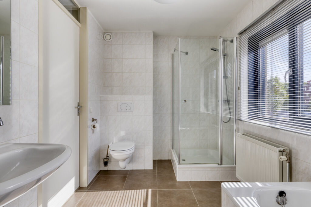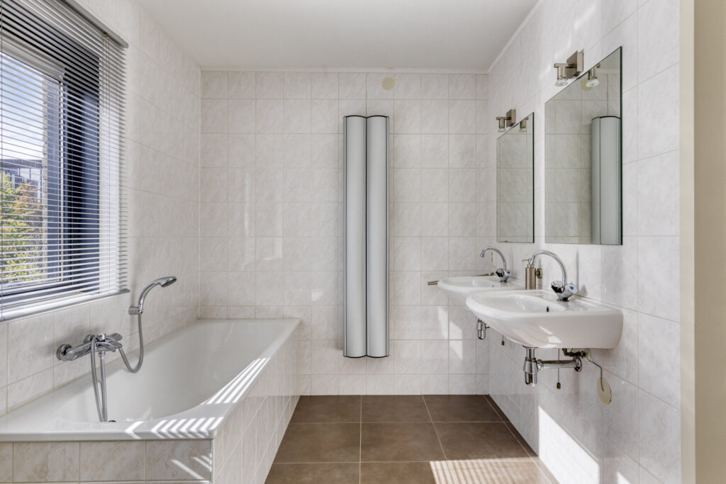 De badkamer is volledig betegeld en uitgerust met een ligbad, douchecabine, toilet, twee wastafels en hangend wandmeubel.