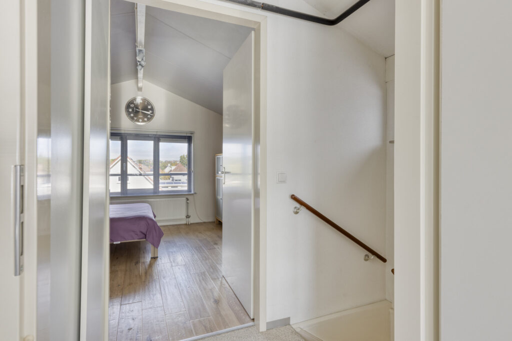 De royale overloop biedt toegang tot drie slaapkamers en de badkamer. De trap en overloop zijn afgewerkt met een onderhoudsvriendelijke grindvloer, terwijl alle aangrenzende slaapkamers zijn voorzien van een houten vloer.