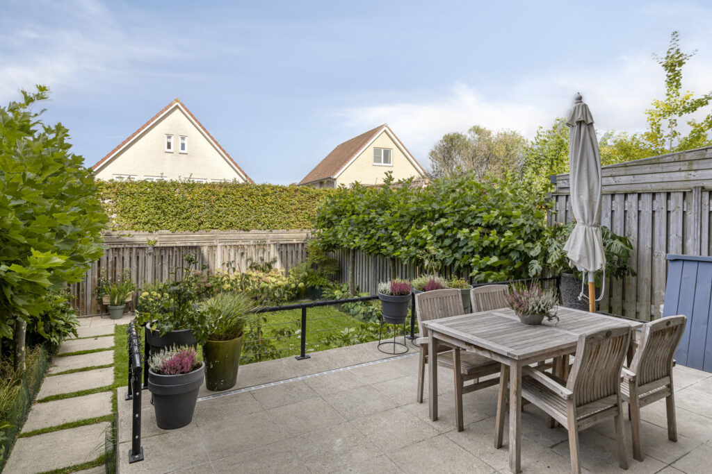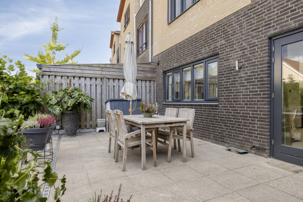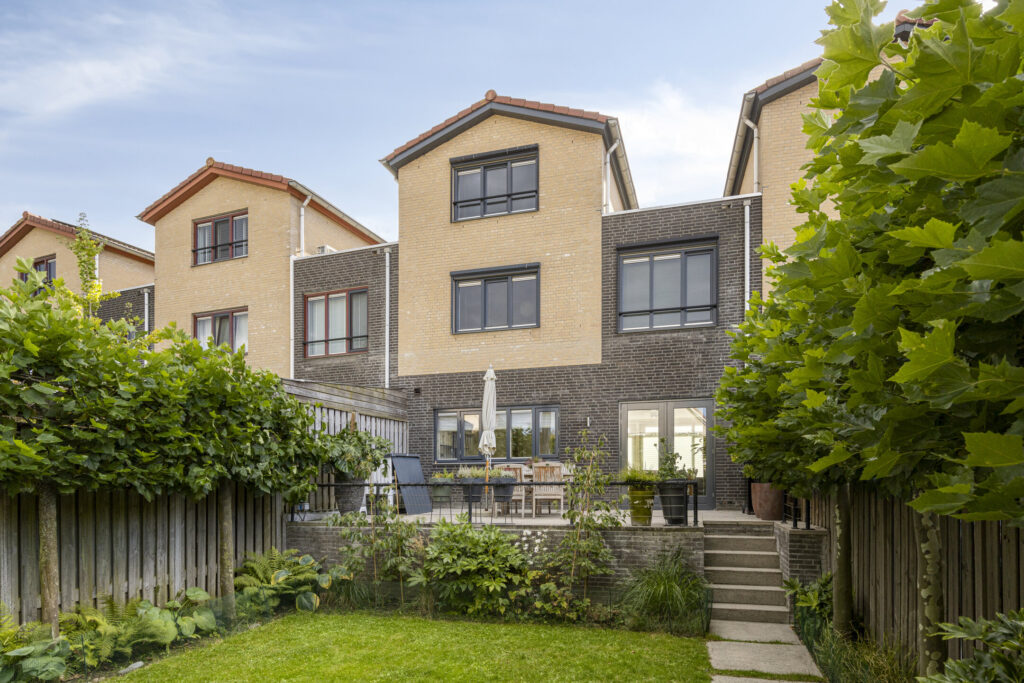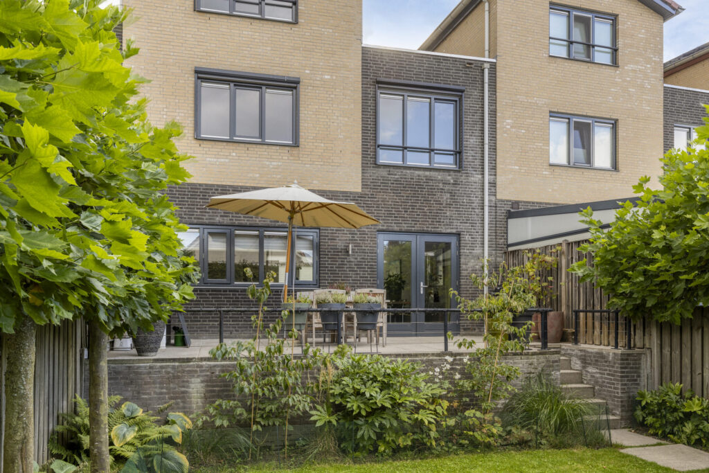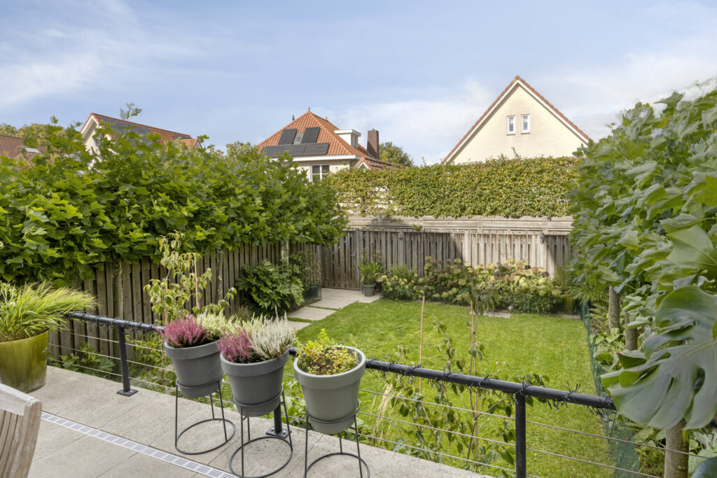 De achtertuin is een echte eyecatcher en bestaat uit twee niveaus. Op het verhoogde gedeelte bevindt zich een ruim terras, afgewerkt met nette terrastegels en voorzien van elektra en wateraansluiting. Dit is de ideale plek om te loungen, barbecueën of gewoon heerlijk te ontspannen. Via een trap bereikt u het lager gelegen deel van de tuin, waar een mooi gazon en vaste beplanting zorgen voor een groene uitstraling. Daarnaast beschikt de tuin over een praktische achterom.