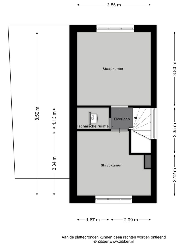 Ook de tweede verdieping biedt veel ruimte. U komt boven op de overloop van deze etage, die toegang geeft tot twee slaapkamers en een bergkast met technische ruimte. De trap, overloop en de slaapkamer aan de voorzijde zijn afgewerkt met een siergrindvloer.