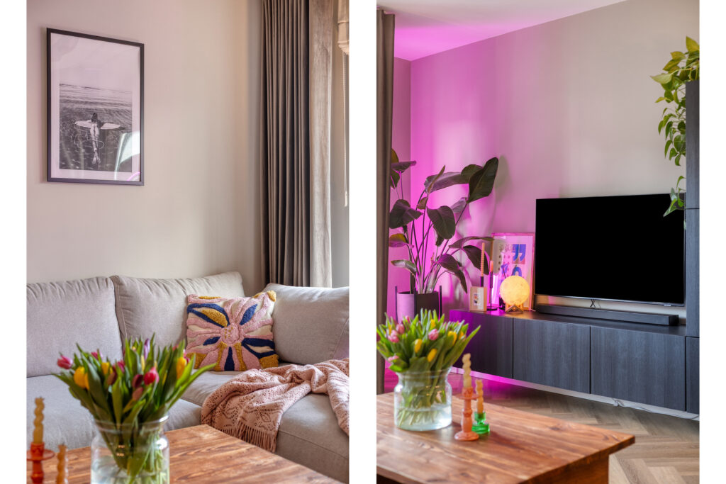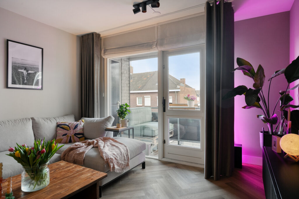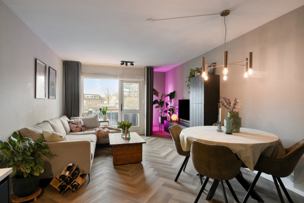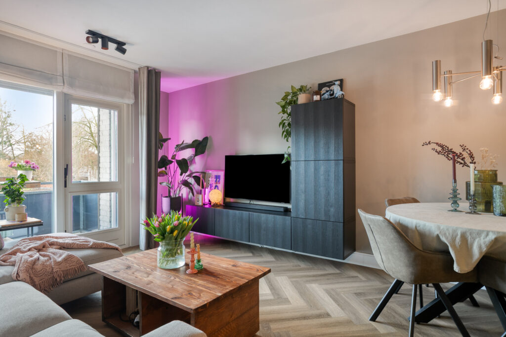 De ruime woonkamer is een fijne verblijfsruimte met een prettige lichtinval door de aanwezigheid van een grote raampartij en een deur naar het balkon.