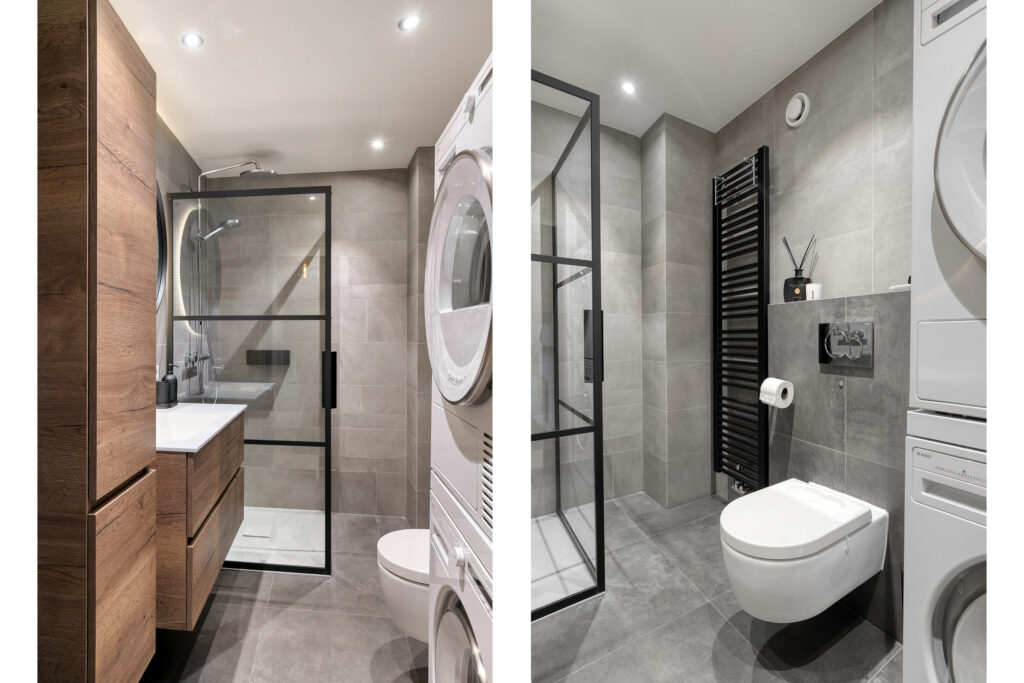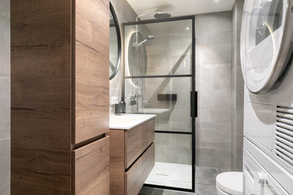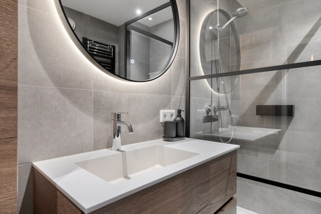 De luxe badkamer is uitgerust met een ruime douche met een thermostaatkraan en stortdouche, een wandcloset, een wastafelmeubel, een spiegel met verlichting, een badkamerkast en een designradiator. Tevens bevindt zich hier de wasmachineaansluiting.