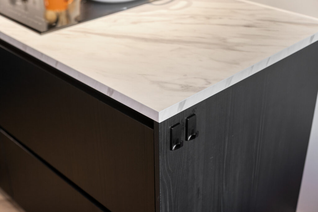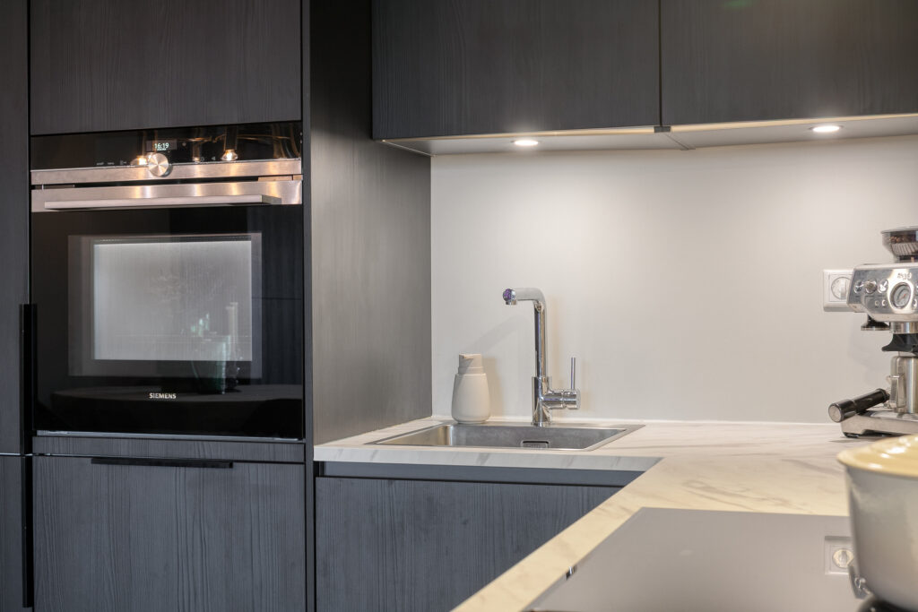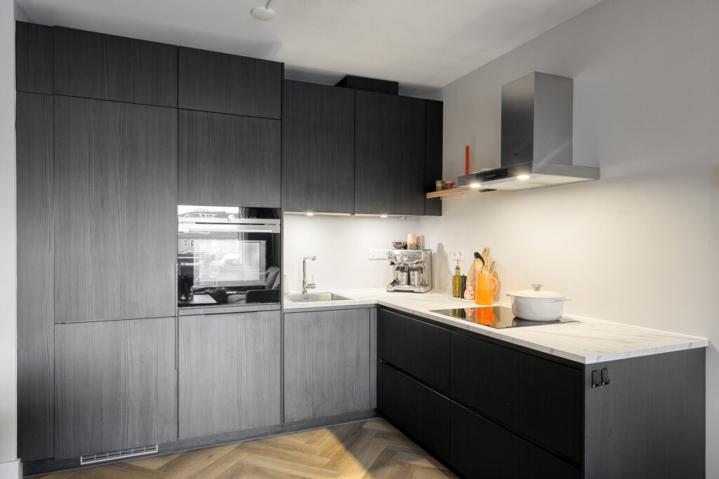 De open keuken is voorzien van een luxe, trendy zwarte (houtlook nerf) keukeninrichting in een hoekopstelling met een marmerlook kunststof aanrechtblad, spoelbak, inductiekookplaat, afzuigkap, combi-oven, vaatwasser, koelkast en een vriezer. De diverse kasten en lades bieden voldoende bergruimte.