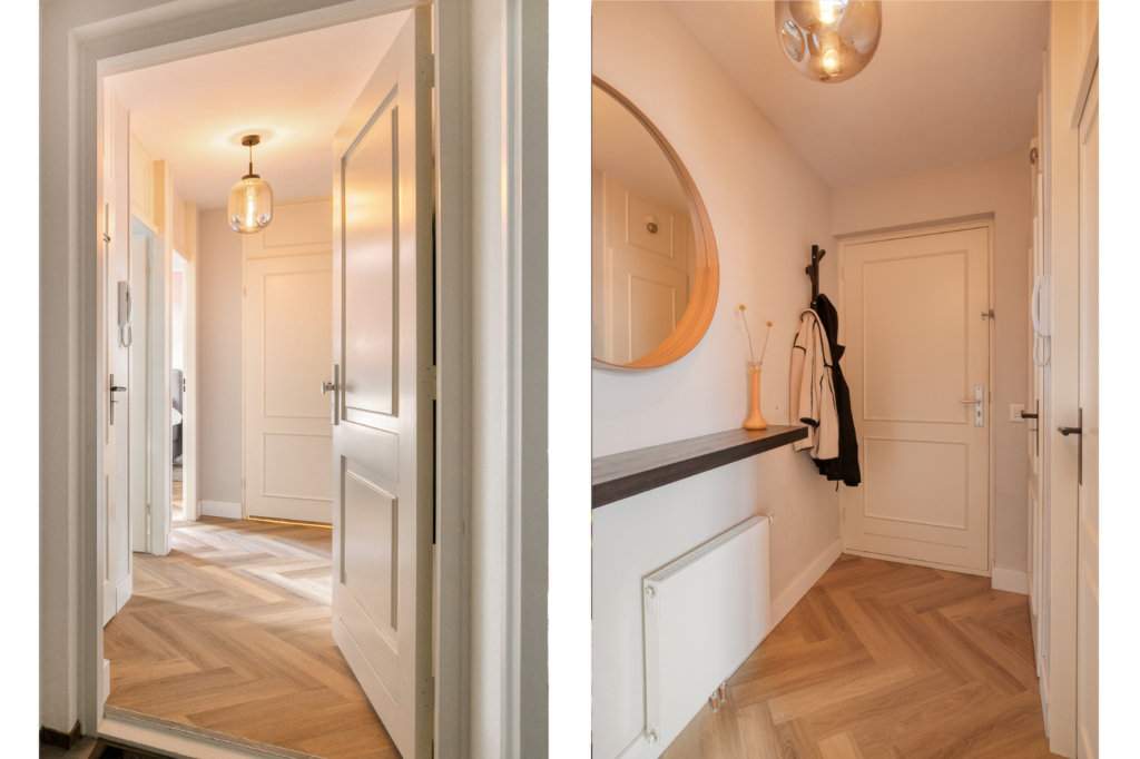 Entree. Via de hal met intercom zijn alle vertrekken te bereiken. Op de vloer ligt een mooie PVC-vloer in visgraat welke doorloopt in de rest van het appartement (m.u.v. de badkamer).