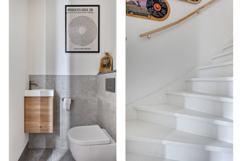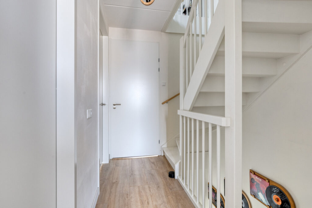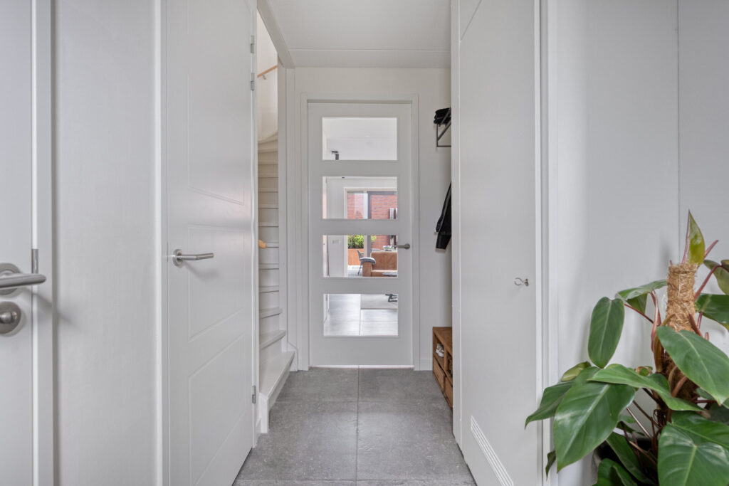 Via de verzorgde voortuin bereik je de entree. Hier bevinden zich het deels betegelde toilet met fonteintje, de meterkast en een praktische kast met de warmtepomp en WTW-installatie.