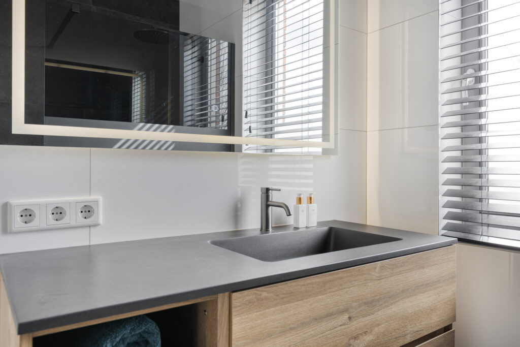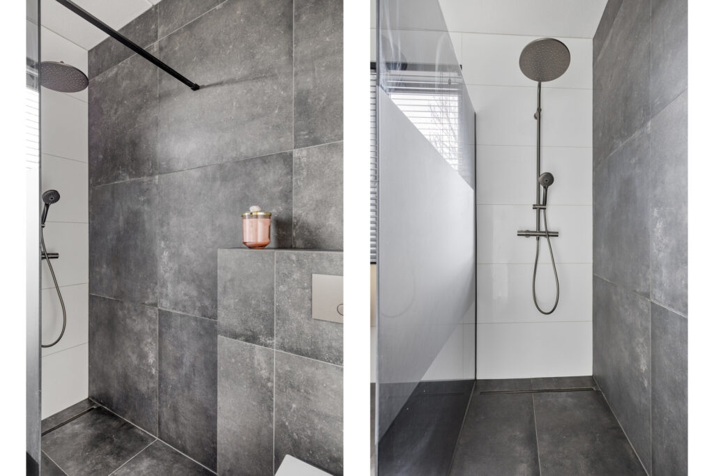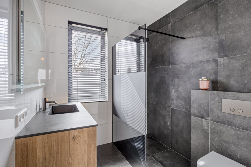De moderne badkamer is volledig betegeld en voorzien van vloerverwarming, een ruime inloopdouche met regendouche en handdouche, een wastafelmeubel en een toilet. Dankzij het raam is er prettig daglicht aanwezig.