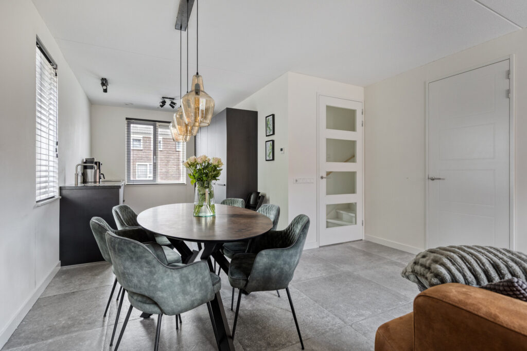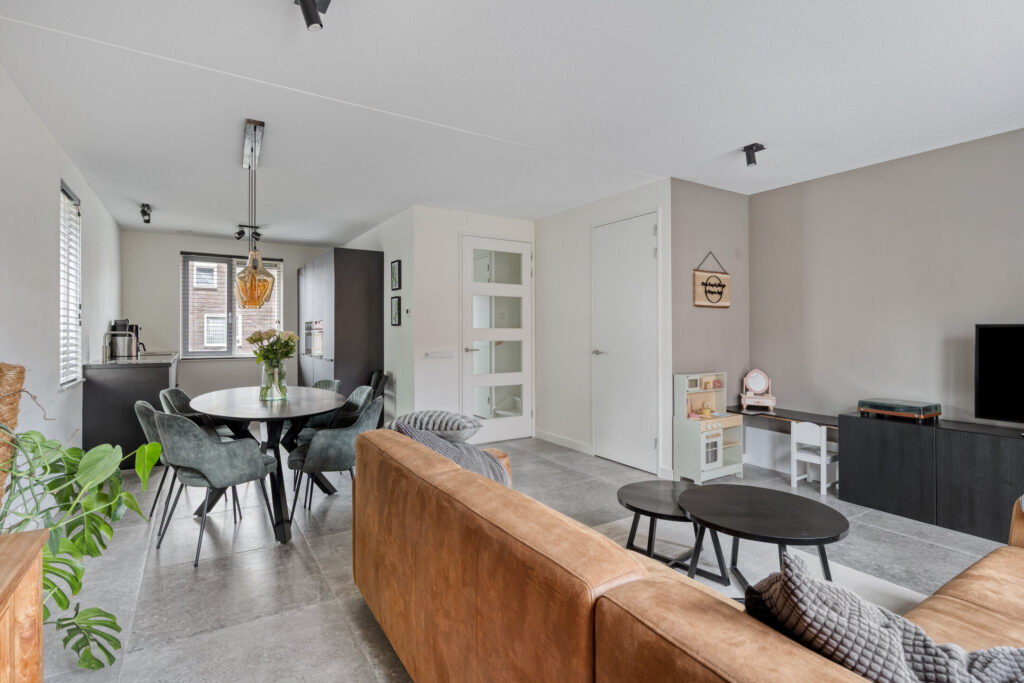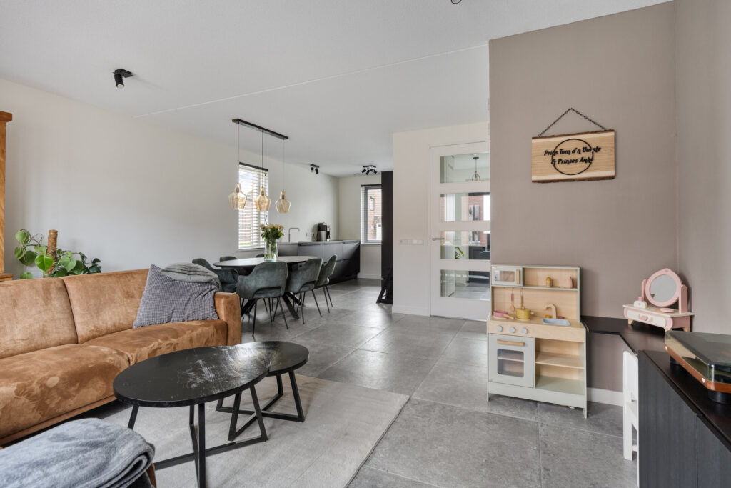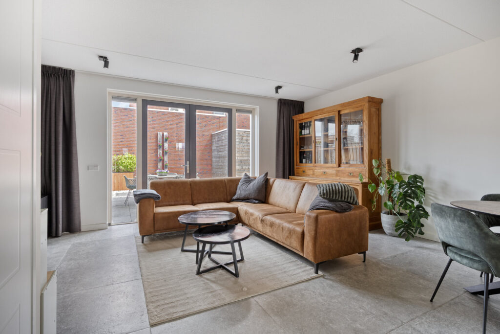 De tuingerichte woonkamer is heerlijk licht dankzij de grote raampartijen en openslaande tuindeuren. De ruimte is afgewerkt met een moderne tegelvloer met vloerverwarming en strak gestucte wanden. Daarnaast is er een handige provisiekast aanwezig.